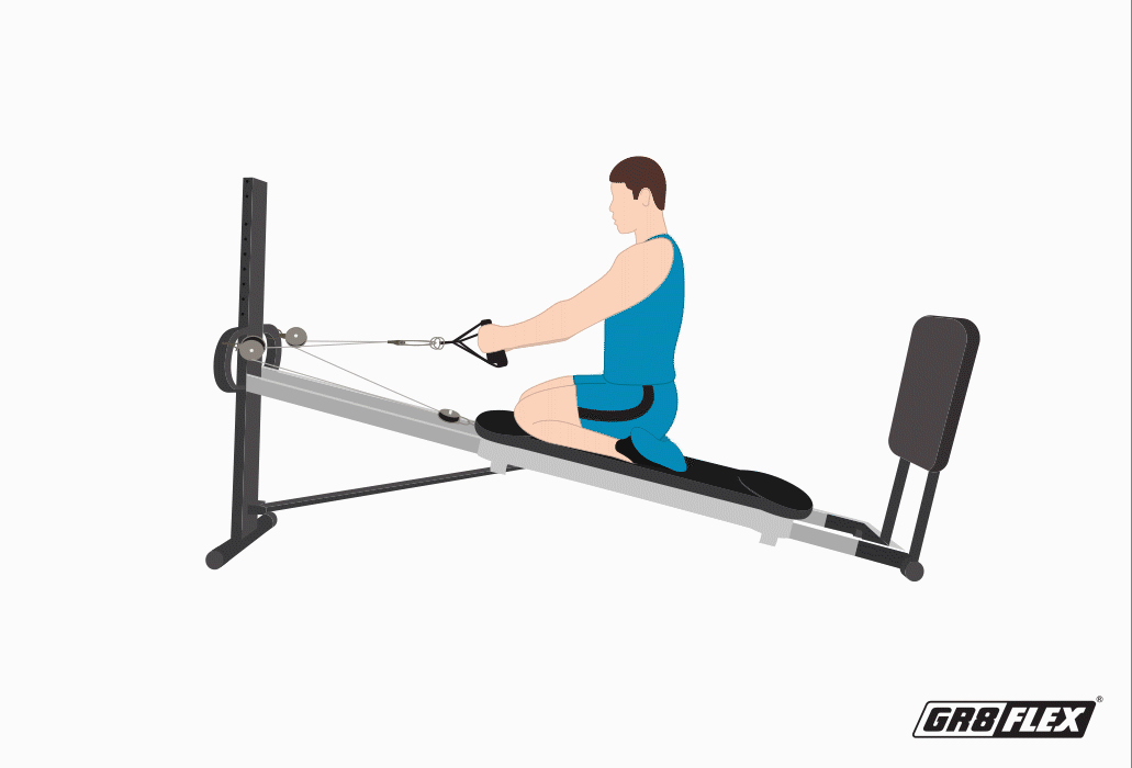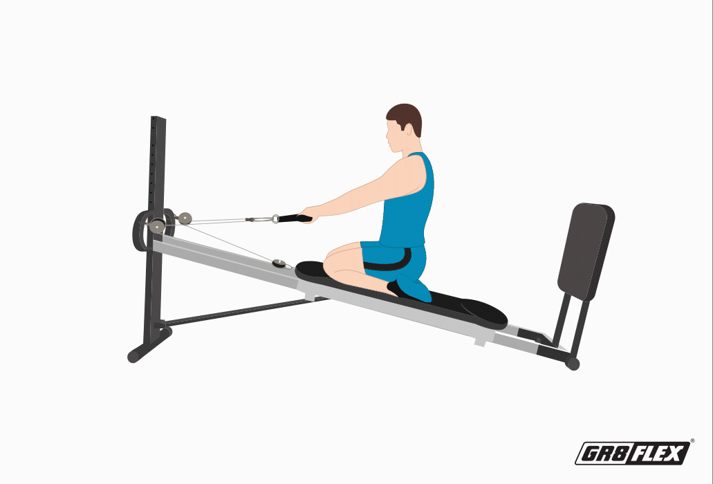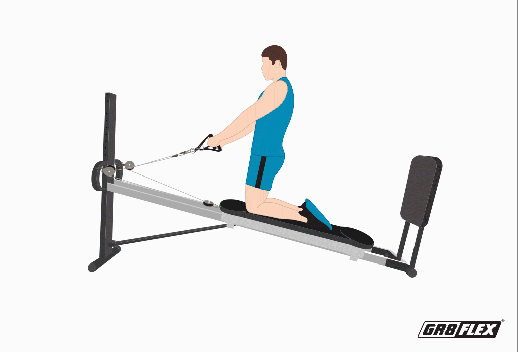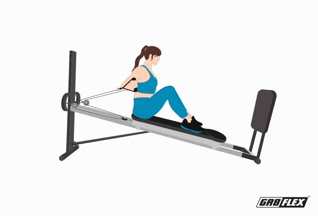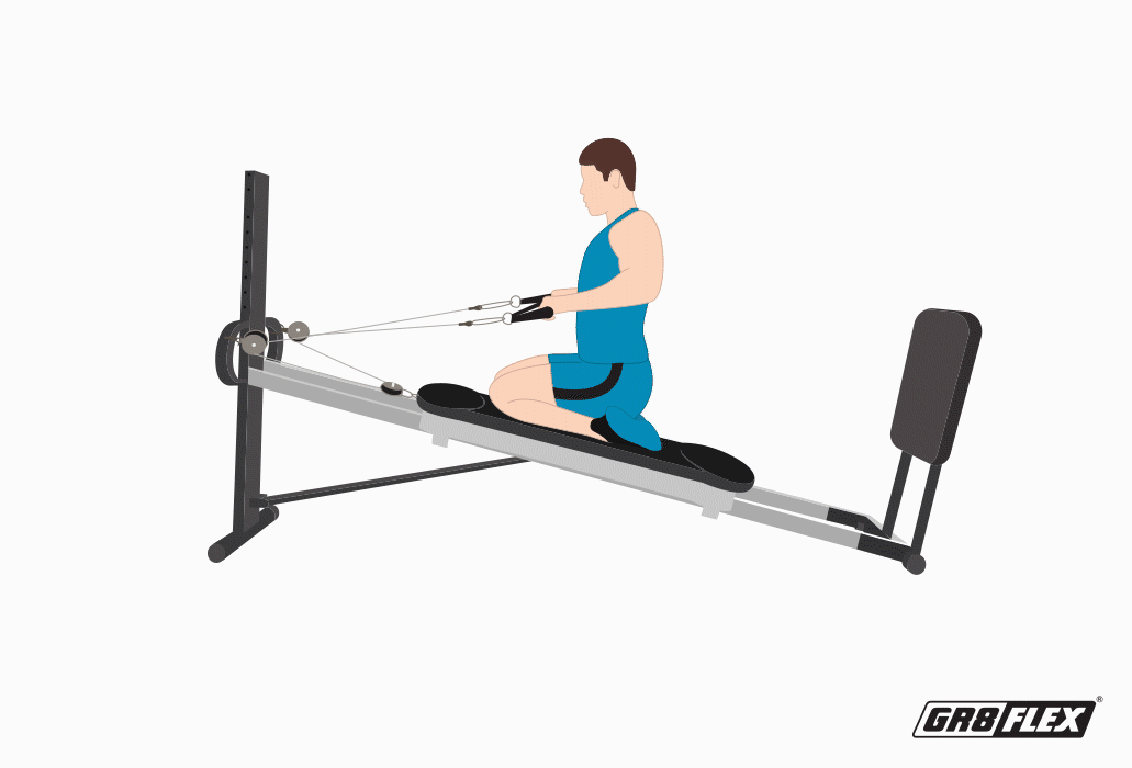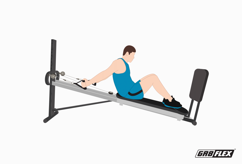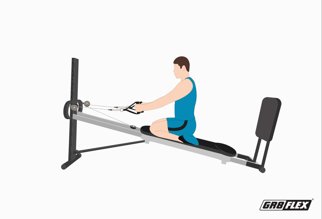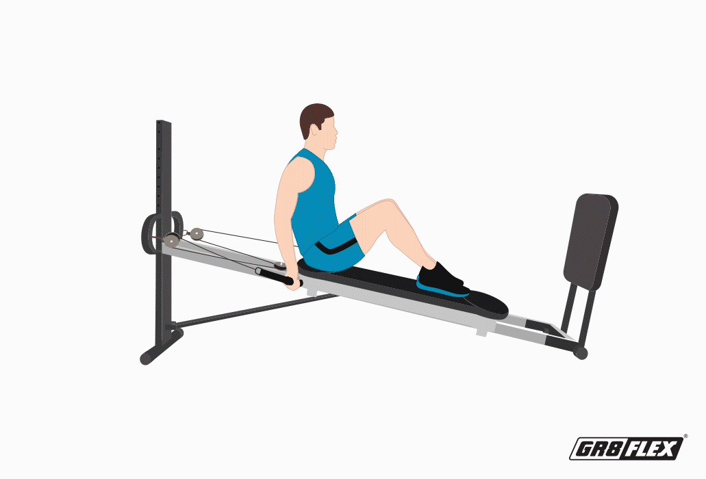 Sit on the bench pad and secure the handles attachment on the GR8Flex. With an erect posture and a straight back, pull the handles with a pronated hand position towards your sternum and allow your feet to hang so you can pull yourself towards the cables. Keep your shoulders retracted and back neutral throughout the pull. Your elbow position should at a 45-degree angle to engage both the back and shoulders. Lower yourself slowly, and keep your hips and back straight and completely neutral. Avoid leaning forward or backward during the movement by allowing for a brief pause at the beginning and end of every repetition.