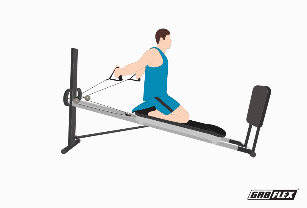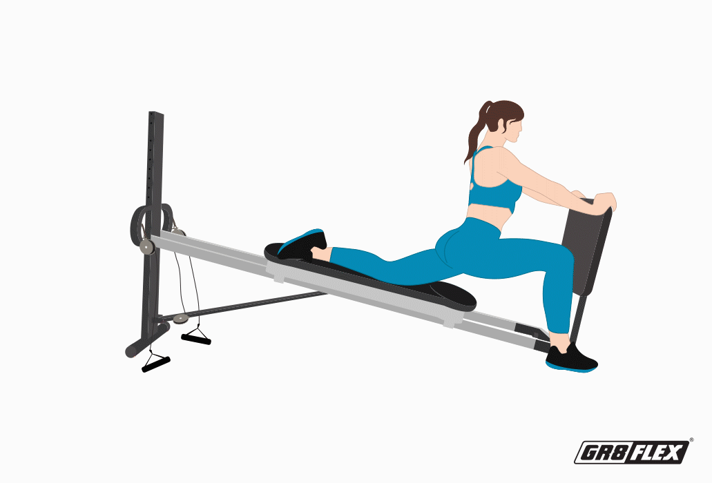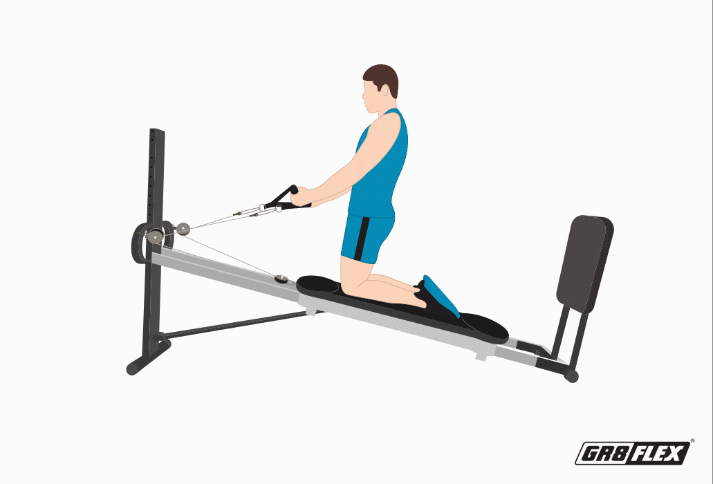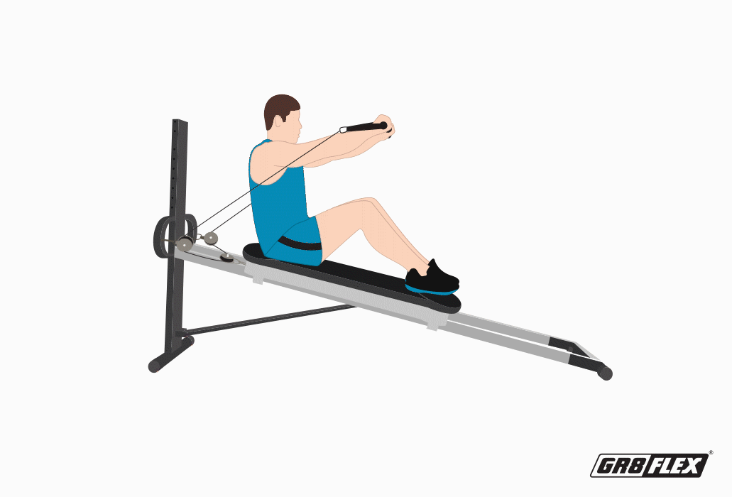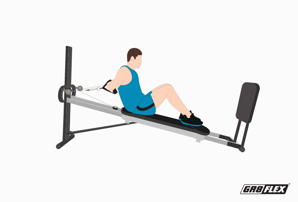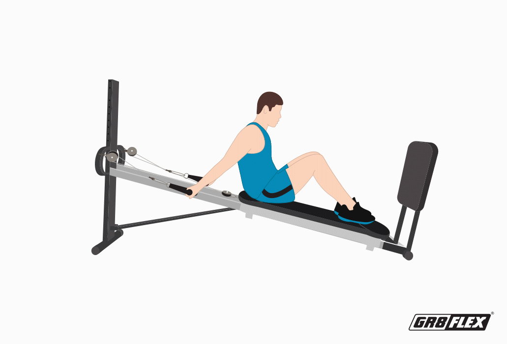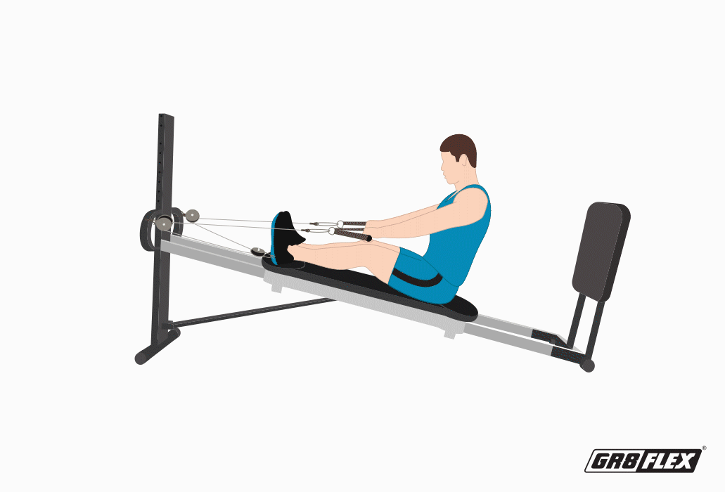Sit on the bench pad and secure the handles attachment on the GR8Flex. With an erect posture and a straight back, pull the handles with a pronated hand position towards your sternum and allow your feet to hang so you can pull yourself towards the cables. Keep your shoulders retracted and back neutral throughout the pull. Your elbow position should at a 45-degree angle to engage both the back and shoulders. Lower yourself slowly, and keep your hips and back straight and completely neutral. Avoid leaning forward or backward during the movement by allowing for a brief pause at the beginning and end of every repetition.