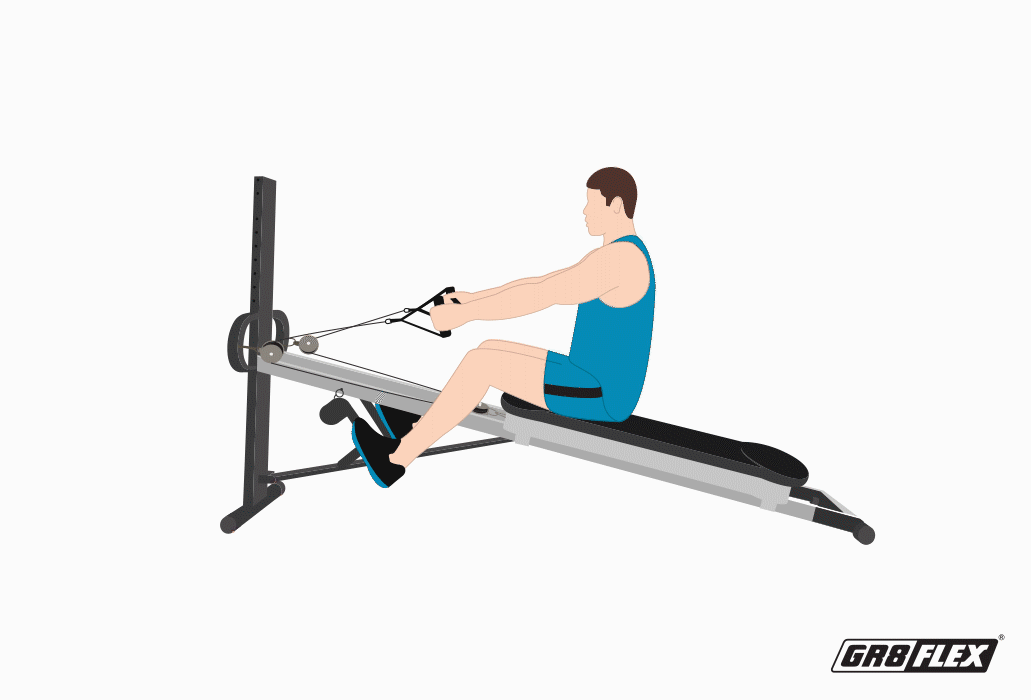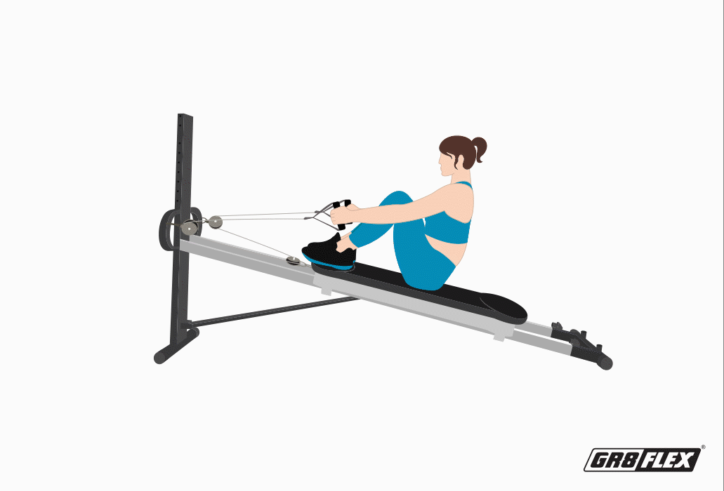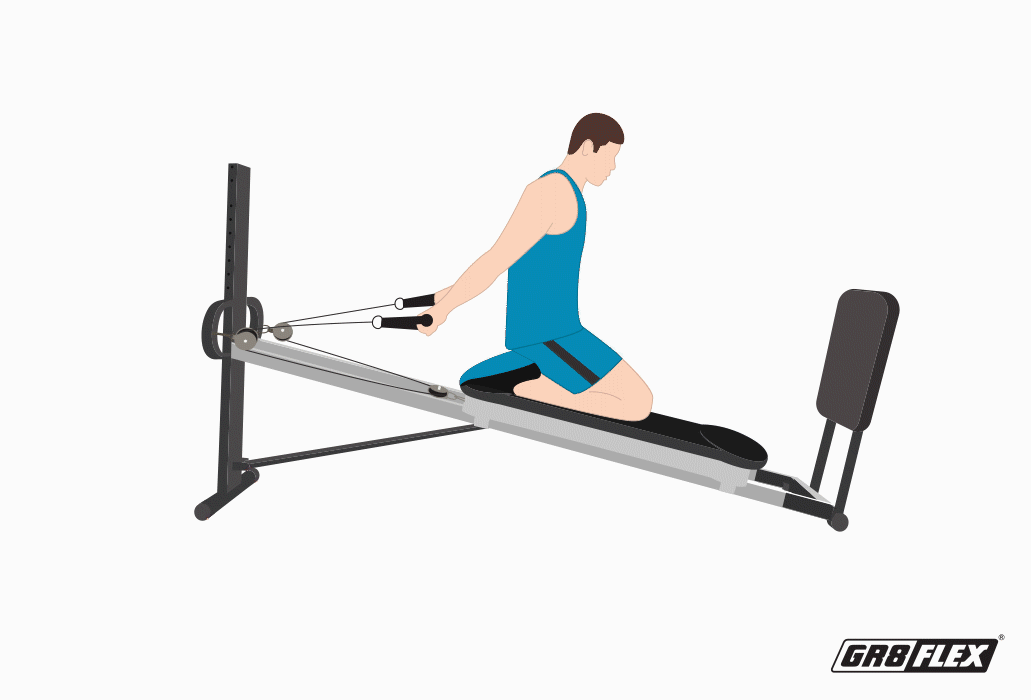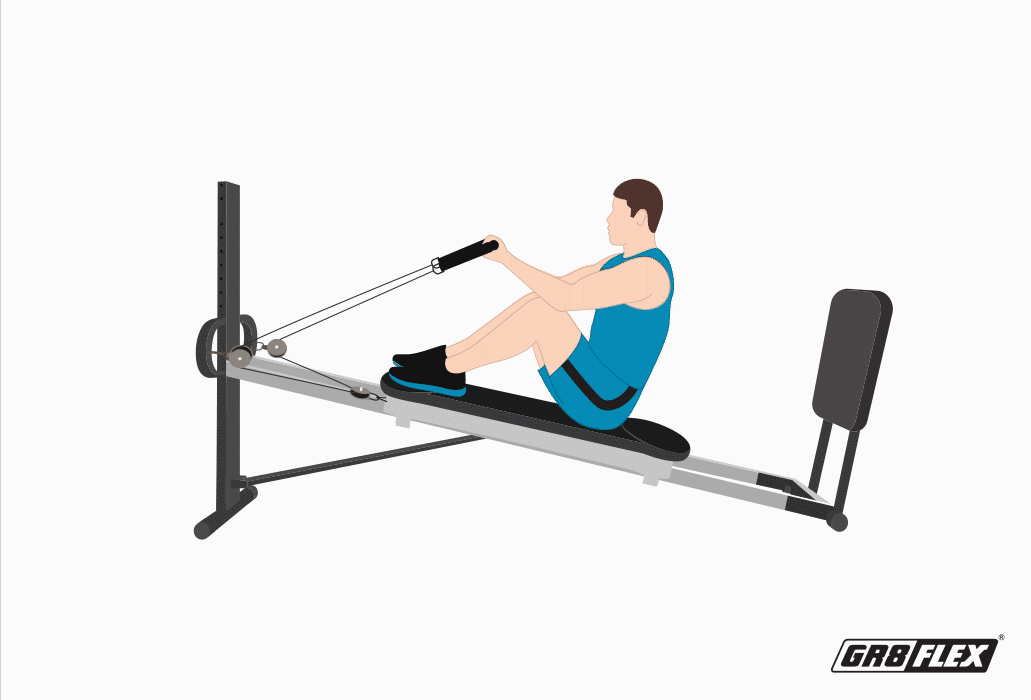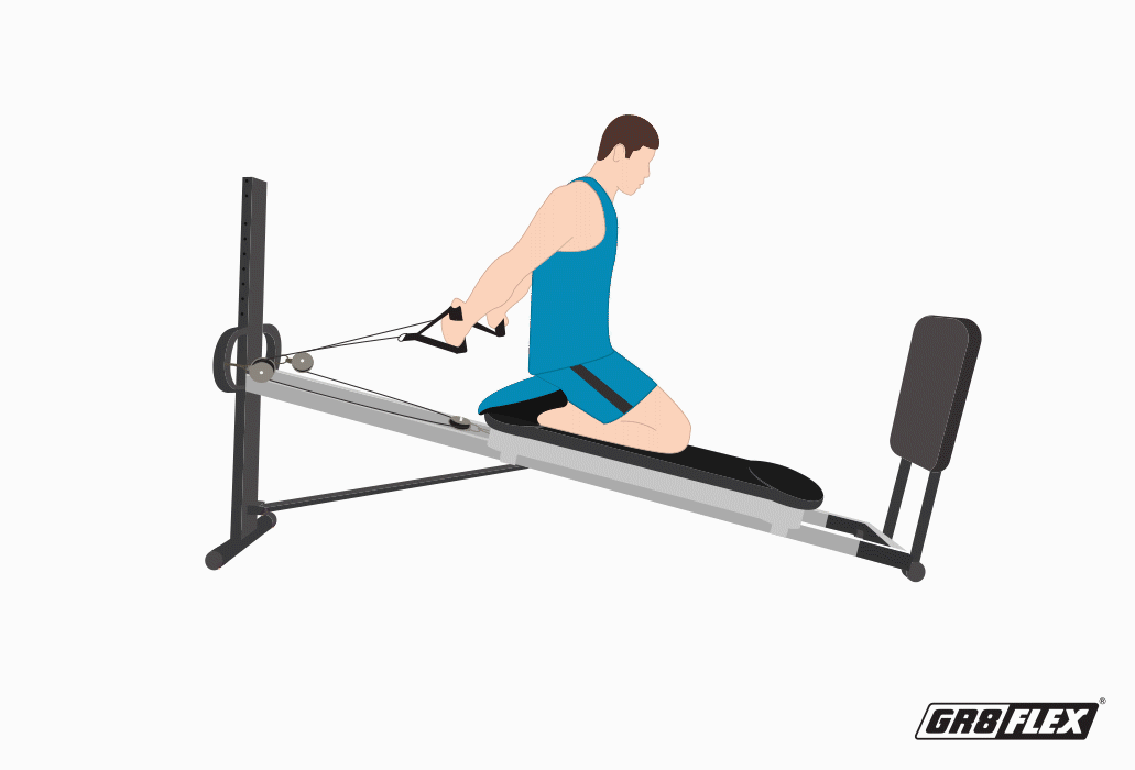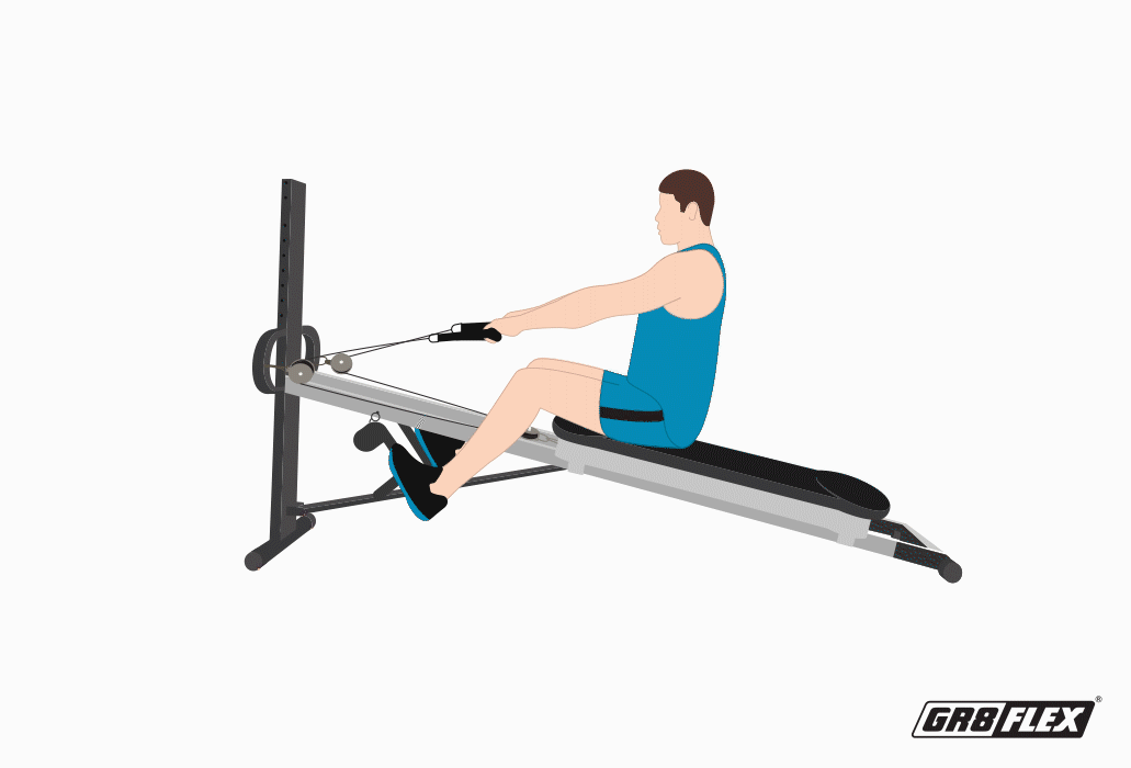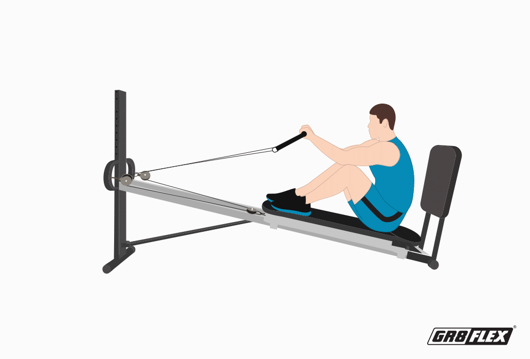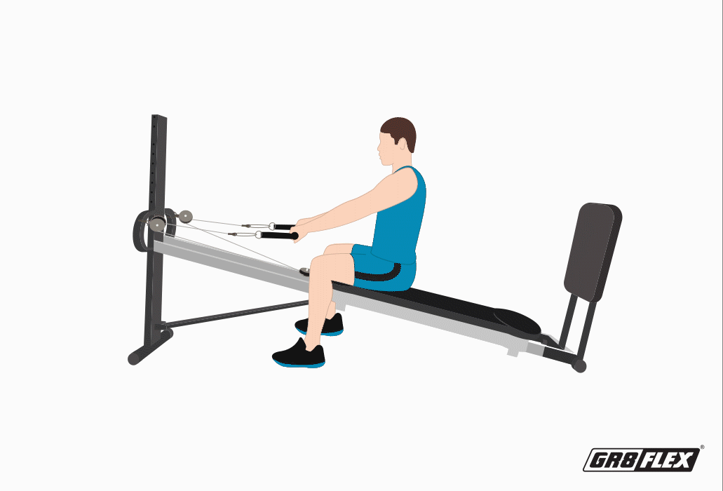 Sit on the bench pad and secure the handles attachment on the GR8Flex. With an erect posture and a straight back, pull the handles with a pronated hand position towards your sternum and allow your feet to hang so you can pull yourself towards the cables. Keep your shoulders retracted and back neutral throughout the pull. Your elbow position should at a 45-degree angle to engage both the back and shoulders. Lower yourself slowly, and keep your hips and back straight and completely neutral. Avoid leaning forward or backward during the movement by allowing for a brief pause at the beginning and end of every repetition.