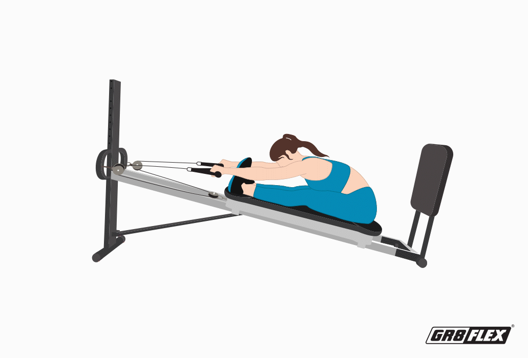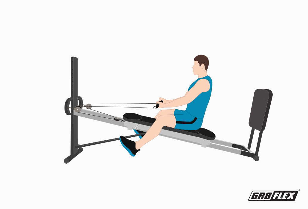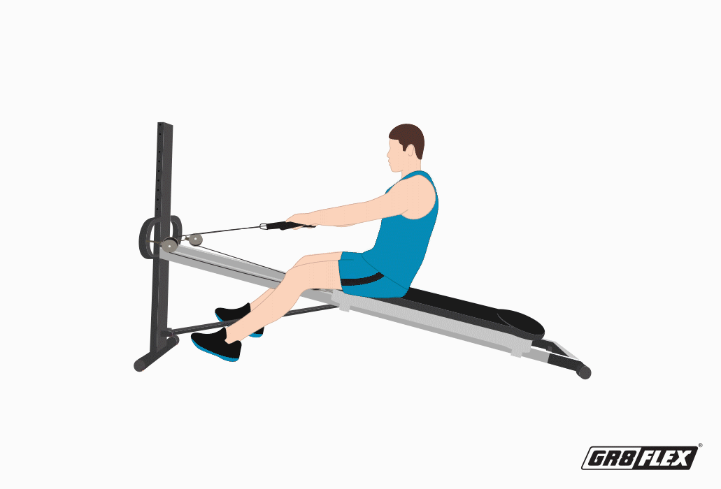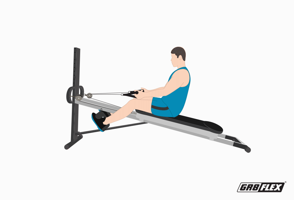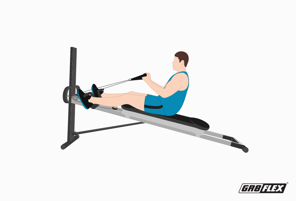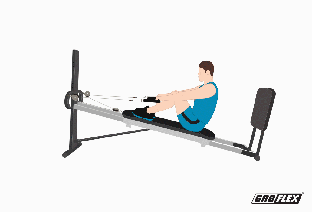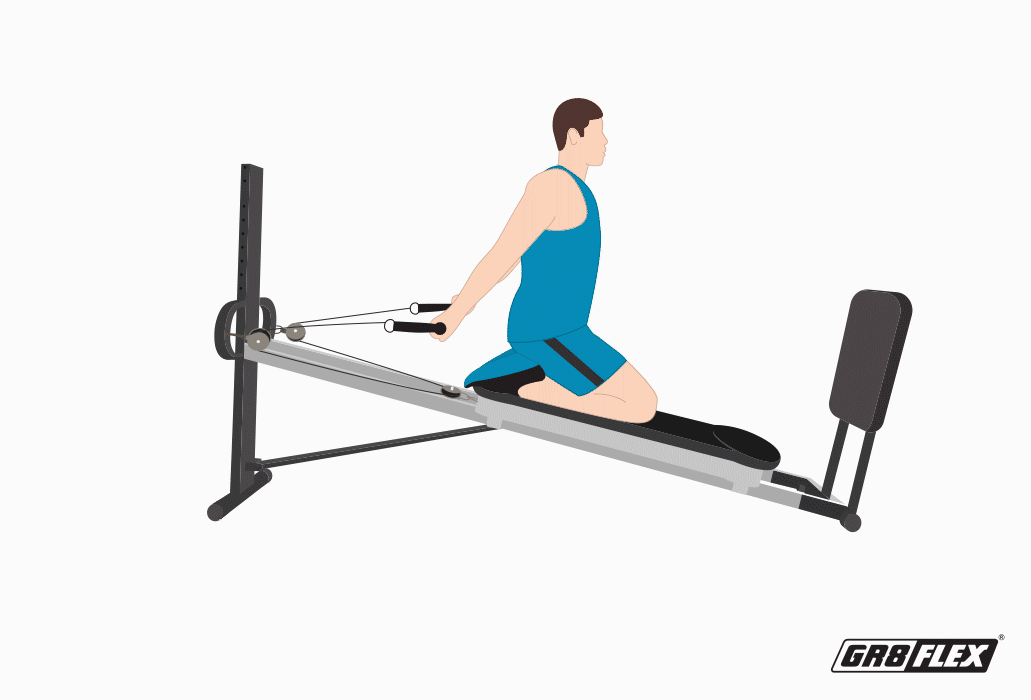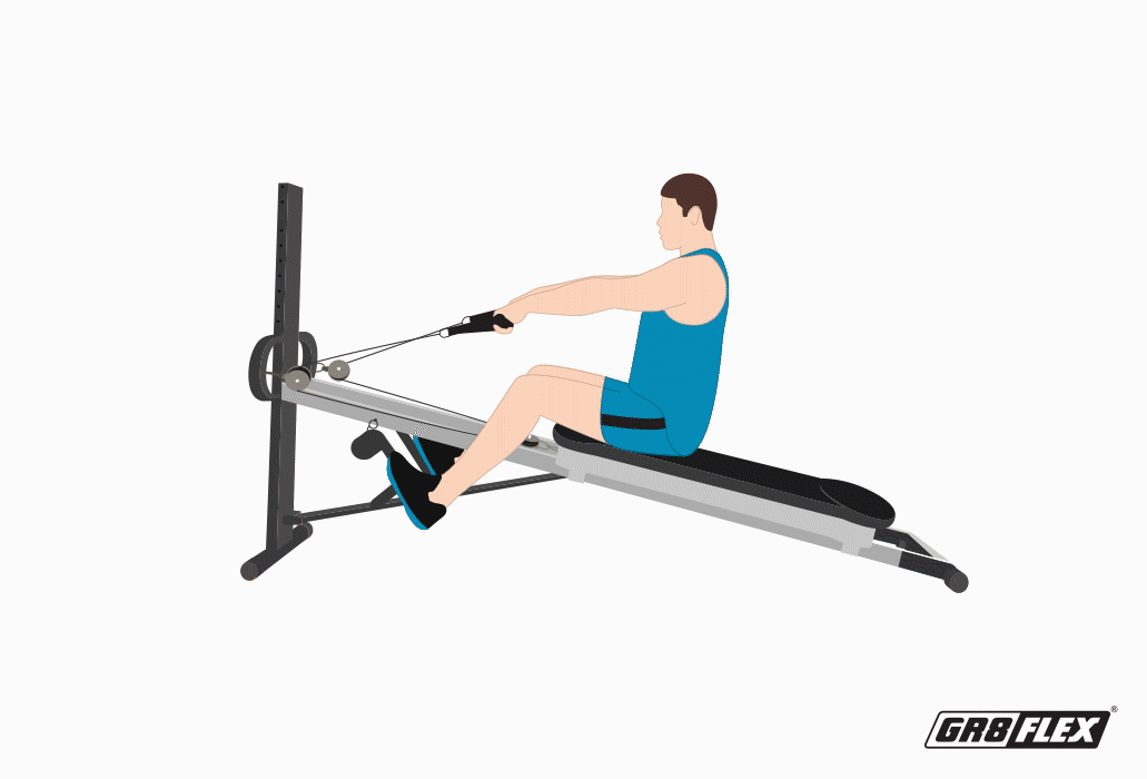 Sit on the bench pad and secure the handles attachment on the GR8Flex. With an erect posture and a straight back, pull the handles with a pronated hand position towards your sternum and allow your feet to hang so you can pull yourself towards the cables. Keep your shoulders retracted and back neutral throughout the pull. Your elbow position should at a 45-degree angle to engage both the back and shoulders. Lower yourself slowly, and keep your hips and back straight and completely neutral. Avoid leaning forward or backward during the movement by allowing for a brief pause at the beginning and end of every repetition.