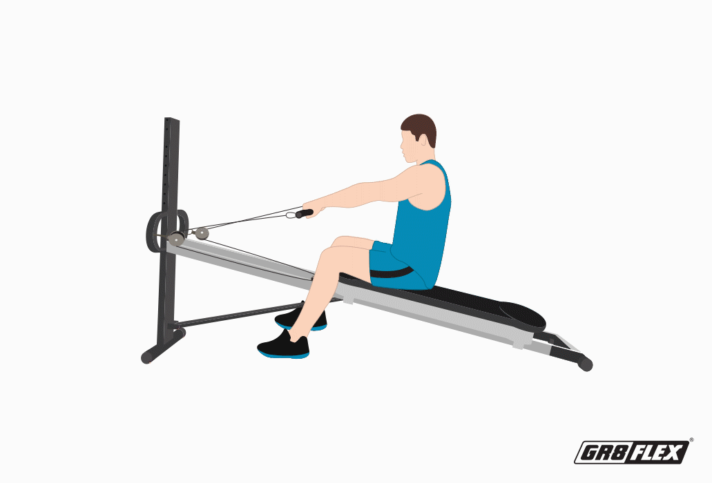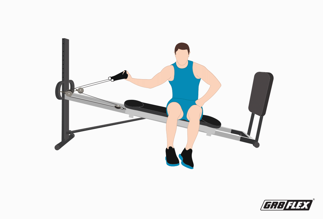 Sit on the bench pad and secure the EZ bar attachment on the GR8Flex. With an erect posture and a straight back, pull the bar with a pronated hand position towards your hips. Keep your shoulders retracted and back neutral throughout the pull. Lower yourself slowly, and keep your hips and back straight and completely neutral. Avoid leaning forward or backward during the movement by allowing for a brief pause at the beginning and end of every repetition.