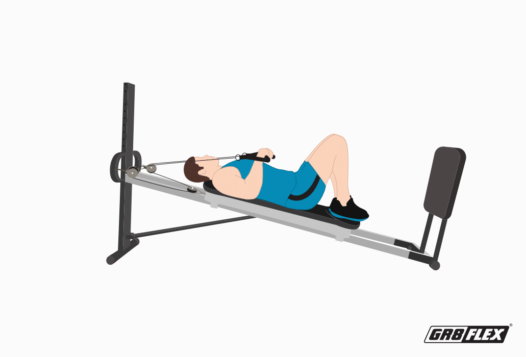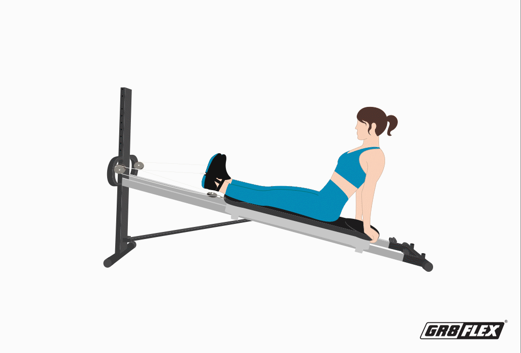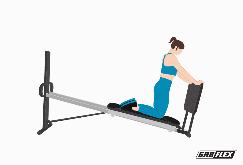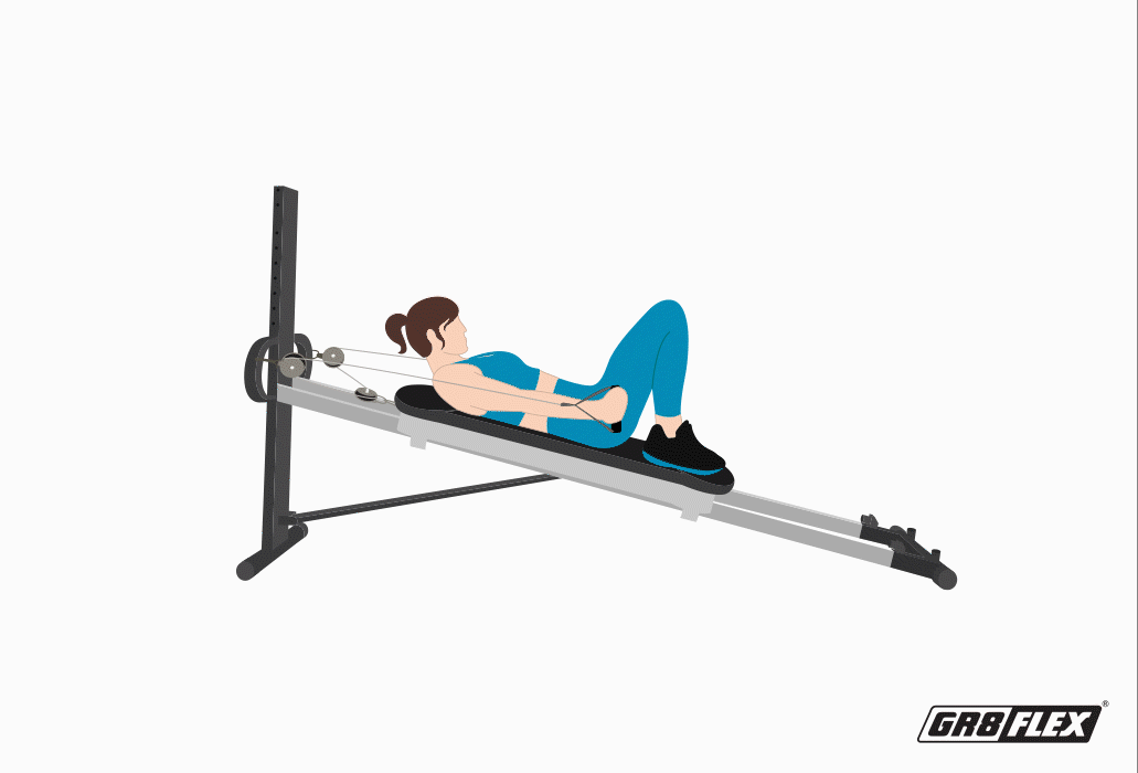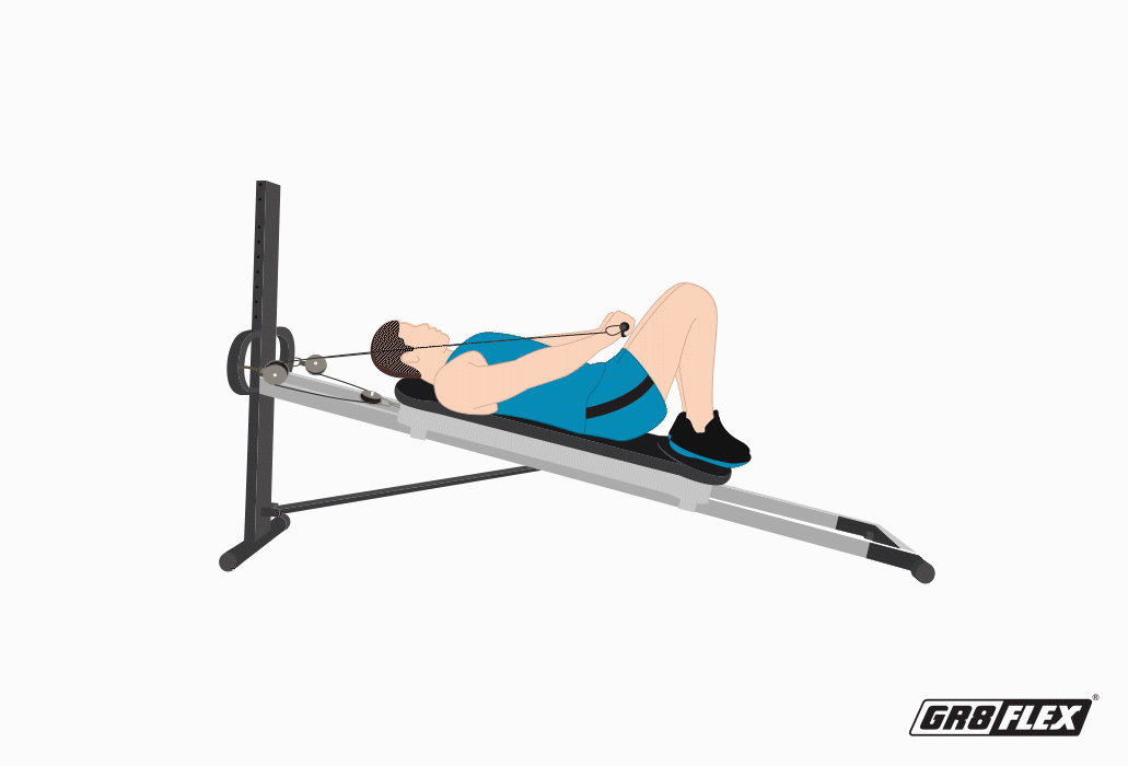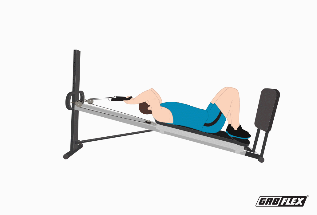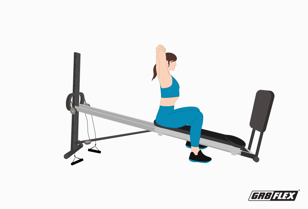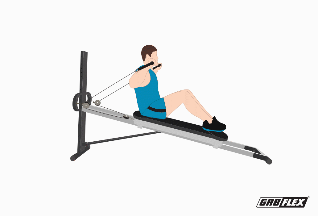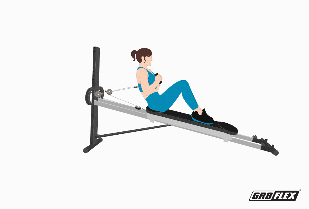 Set the GR8Flex in the incline position so that the squat stand is flattened on the ground. Attach both handles on the cables and sit on the bench pad with your feet on the edge of the pad. Grab both handles and maintain stiff locked arms. In a situp position, extend your back until it touches the bench pad, and then get back to the starting position where your shoulders nearly touch your knees. Maintain an upright back position and locked elbows throughout the movement.