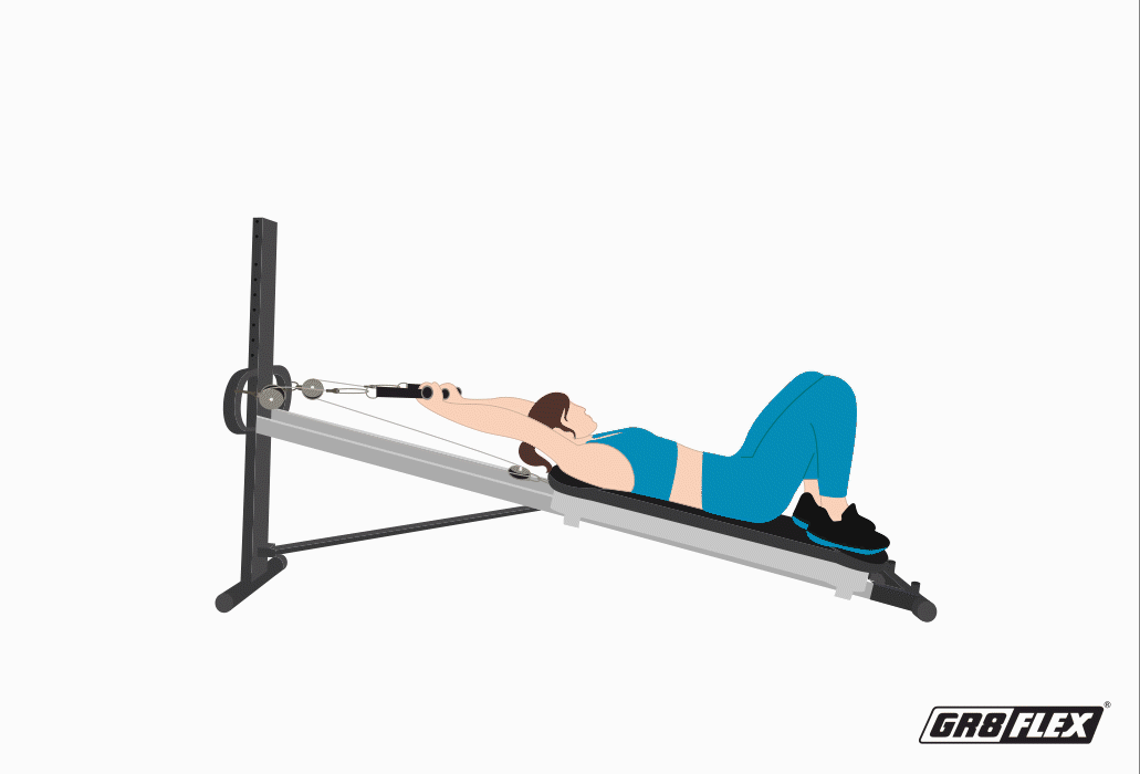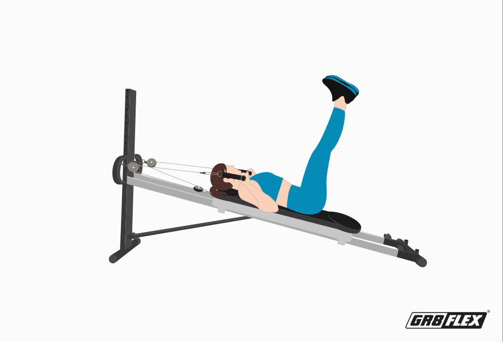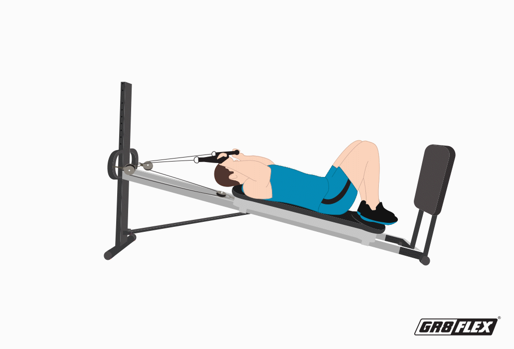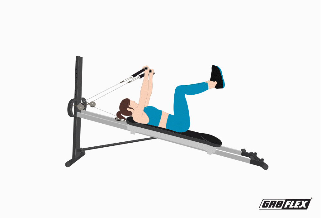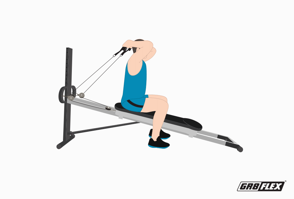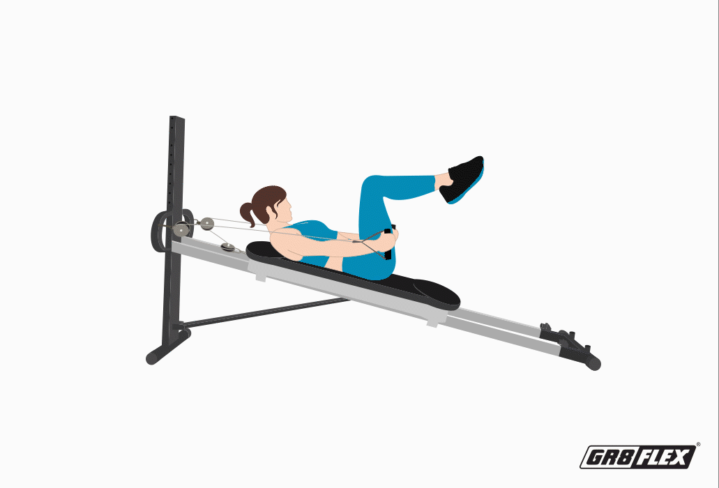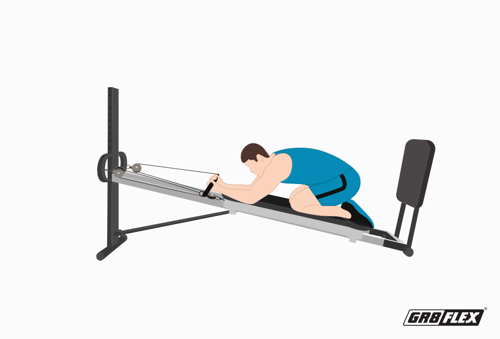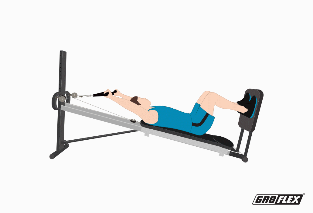 Set the GR8Flex in the incline position so that the squat stand is flattened on the ground. Attach both handles on the cables and sit on the bench pad with your feet on the edge of the pad. Grab both handles and maintain stiff locked arms. In a situp position, extend your back until it touches the bench pad, and then get back to the starting position where your shoulders nearly touch your knees. Maintain an upright back position and locked elbows throughout the movement.