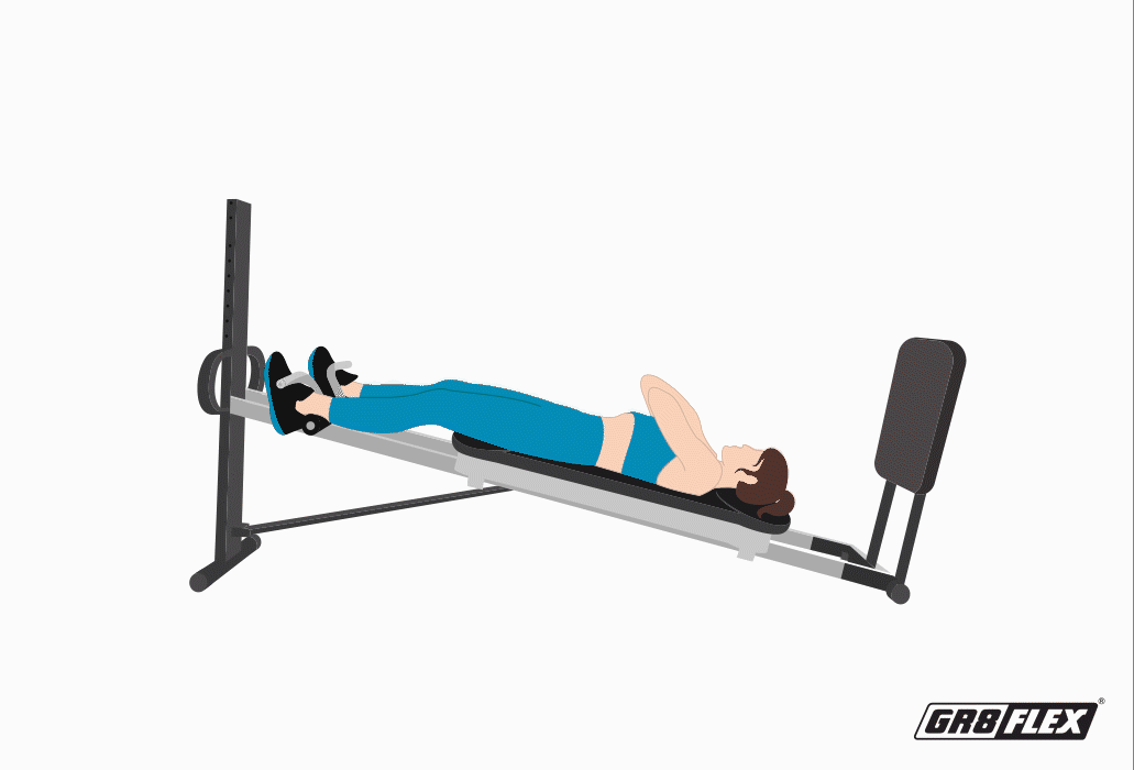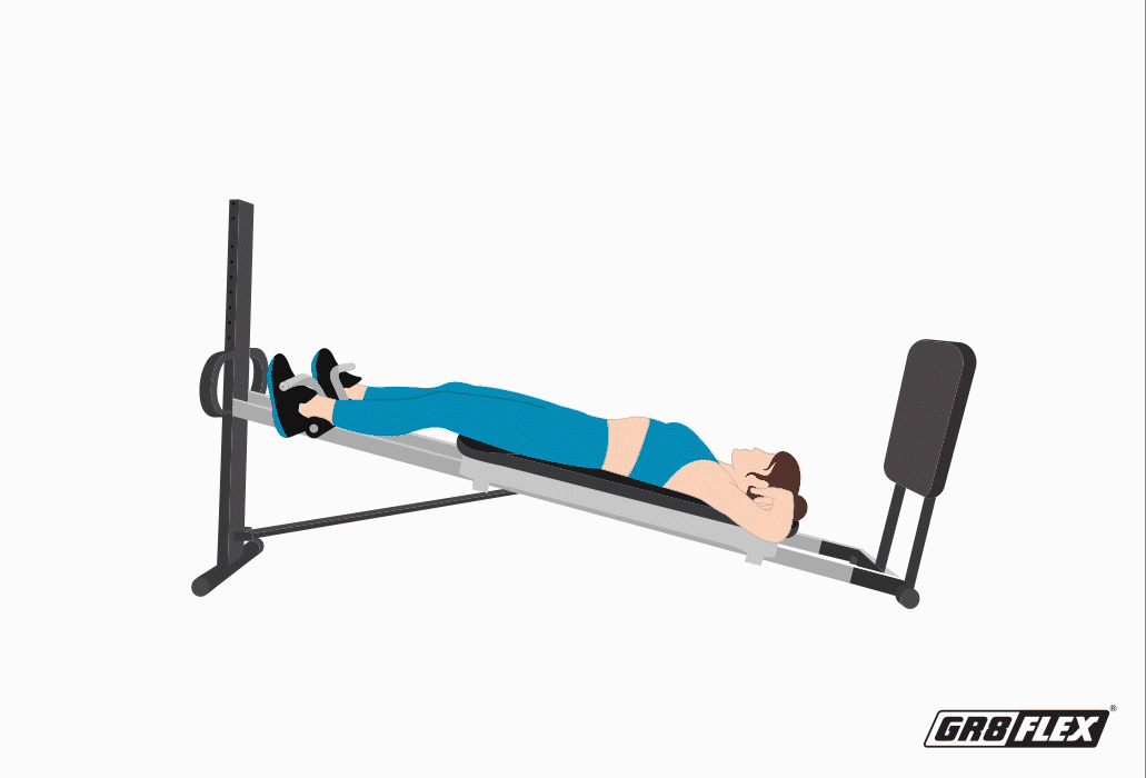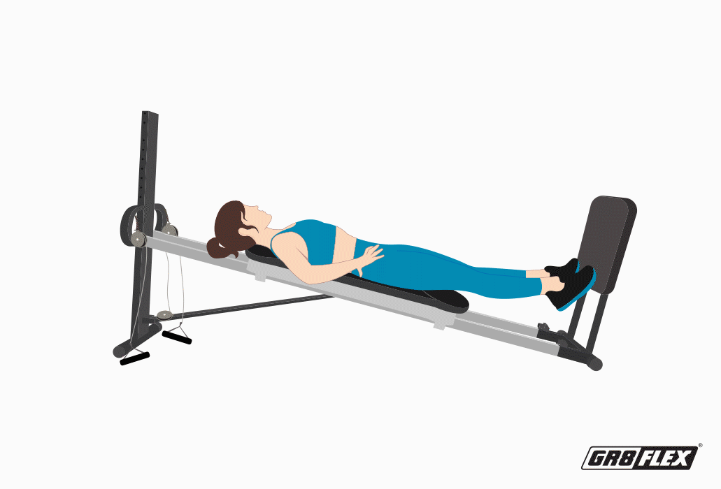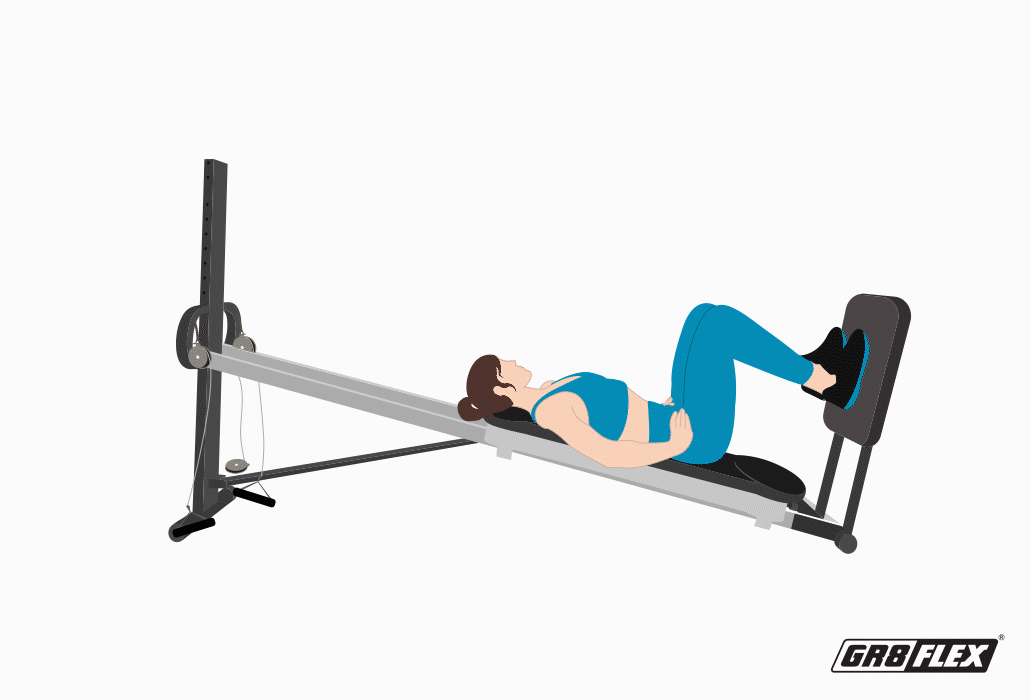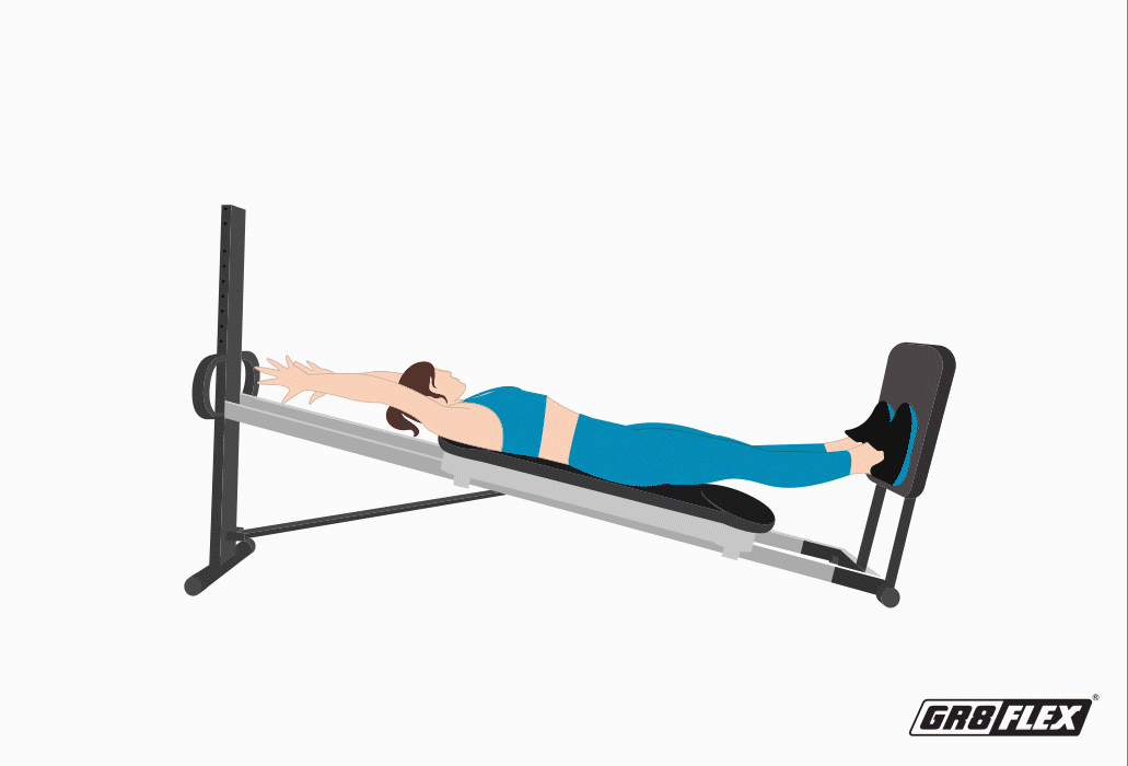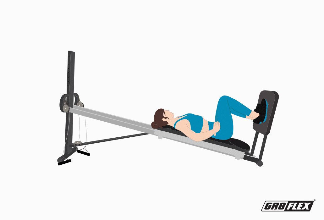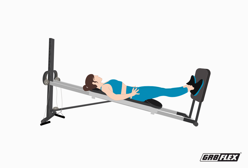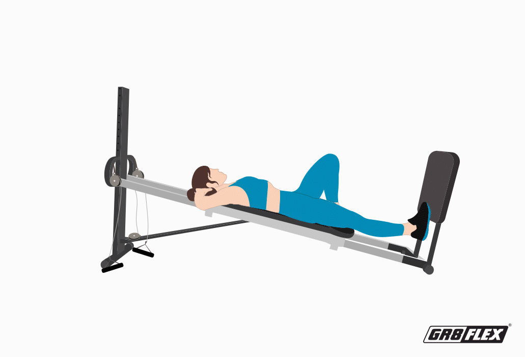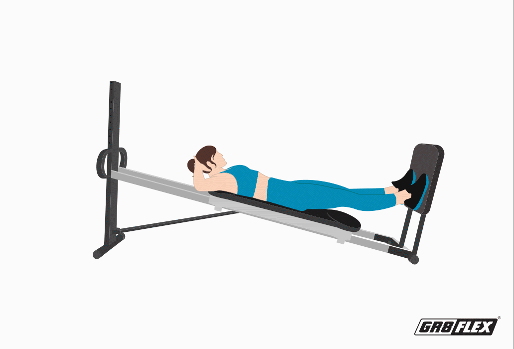 Set the GR8Flex in the incline position so that the squat stand is flattened on the ground. Attach both handles on the cables and sit on the bench pad with your feet on the edge of the pad. Grab both handles and maintain stiff locked arms. In a situp position, extend your back until it touches the bench pad, and then get back to the starting position where your shoulders nearly touch your knees. Maintain an upright back position and locked elbows throughout the movement.