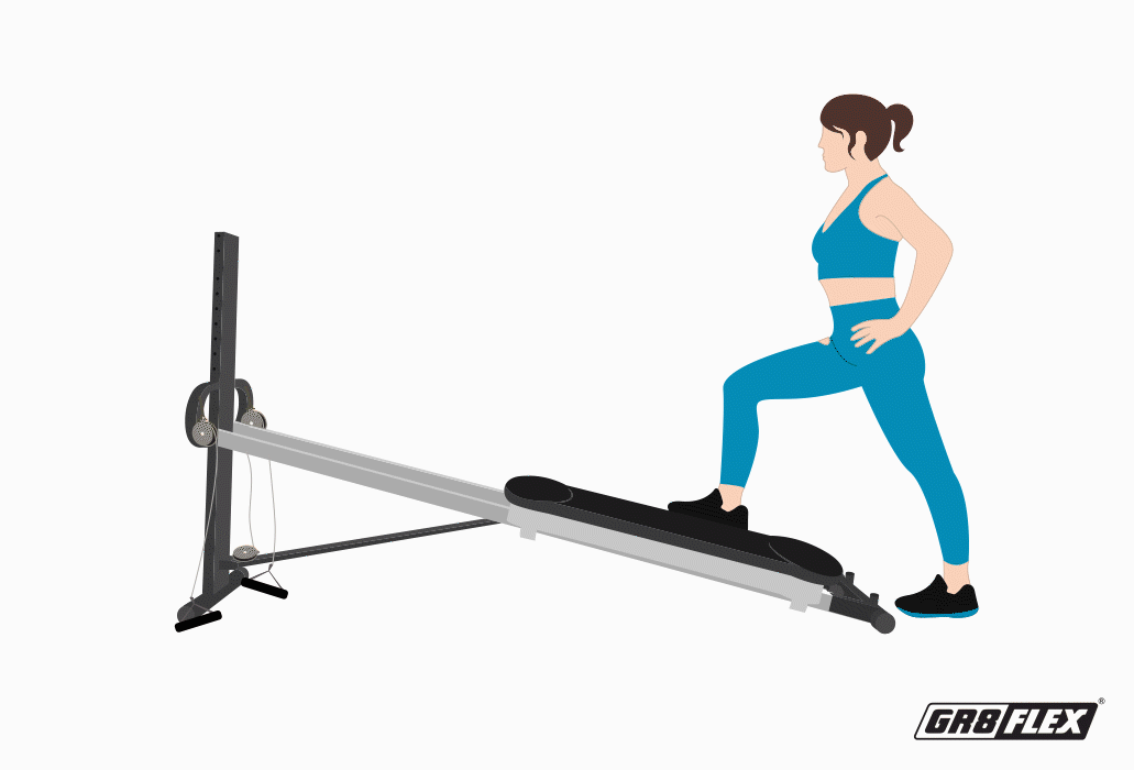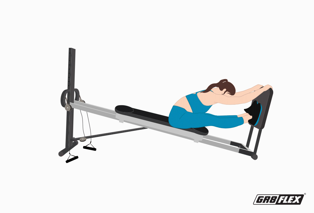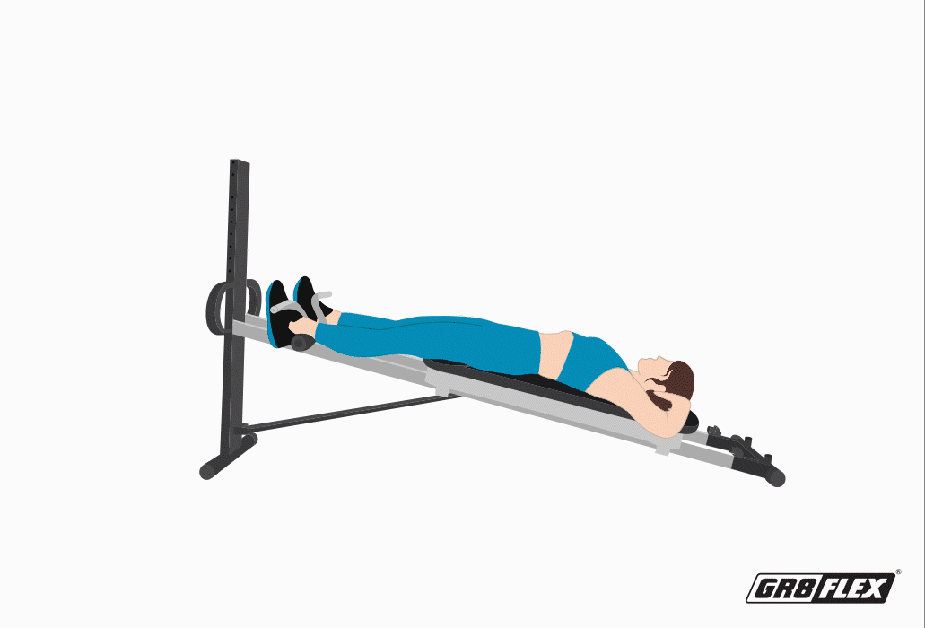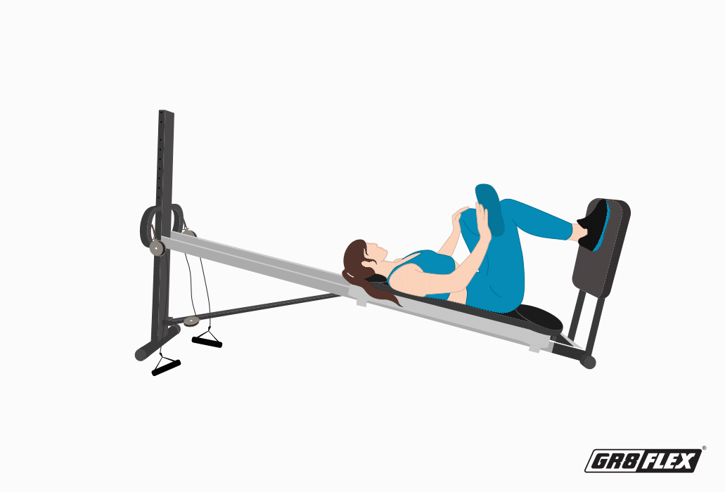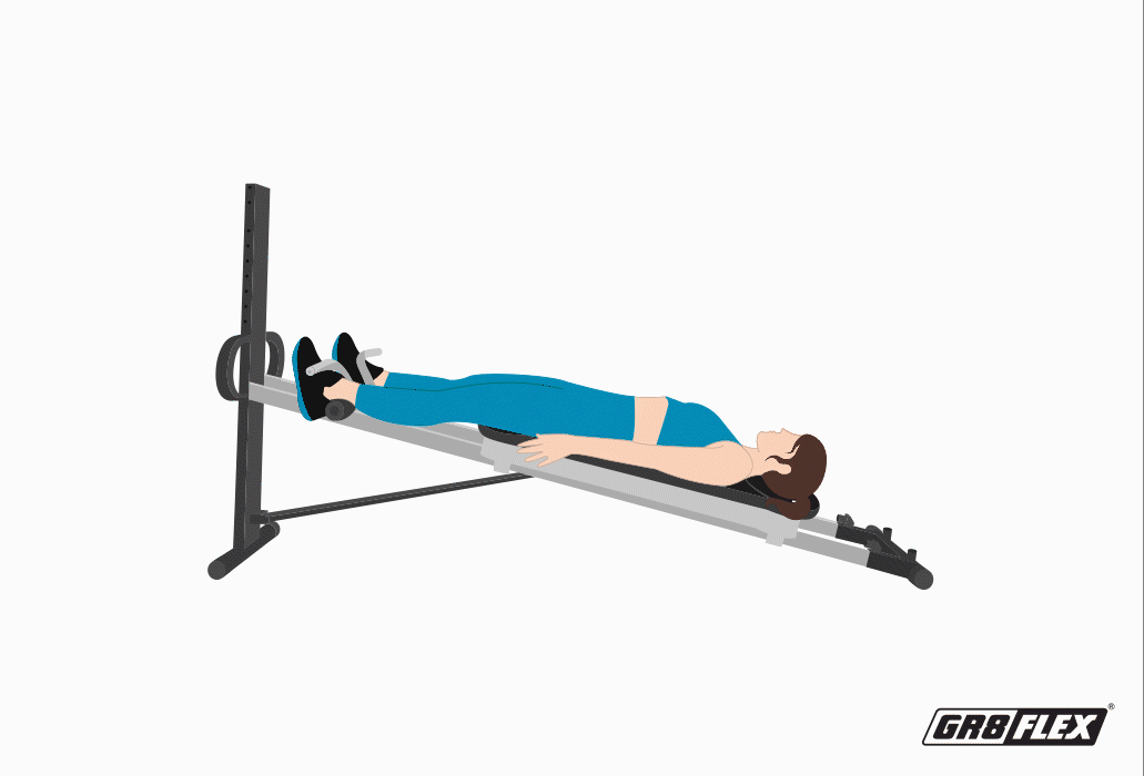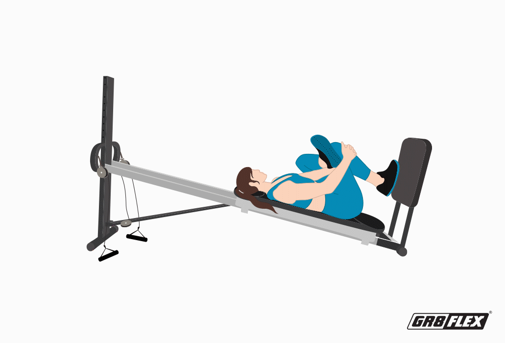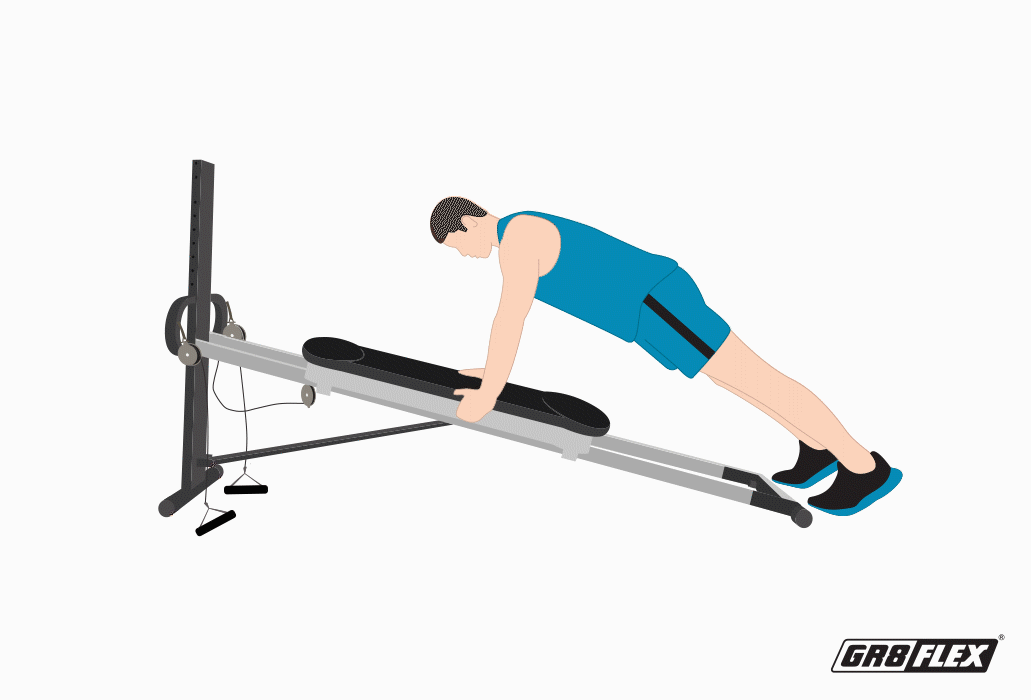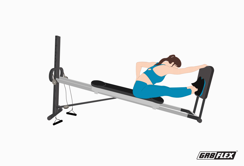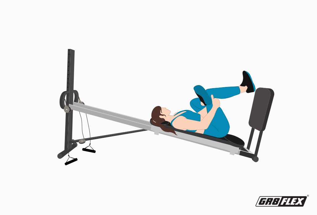 Set the GR8Flex in the incline position so that the squat stand is flattened on the ground. Attach both handles on the cables and sit on the bench pad with your feet on the edge of the pad. Grab both handles and maintain stiff locked arms. In a situp position, extend your back until it touches the bench pad, and then get back to the starting position where your shoulders nearly touch your knees. Maintain an upright back position and locked elbows throughout the movement.