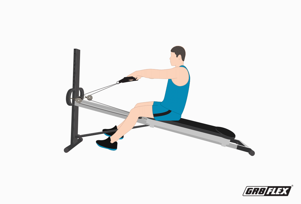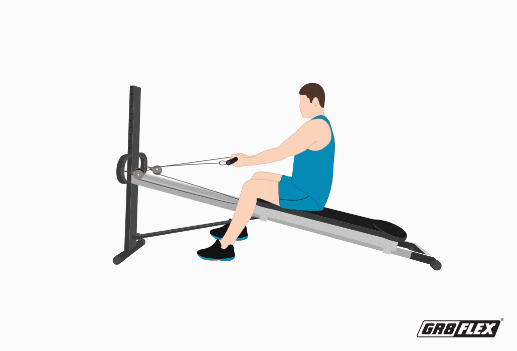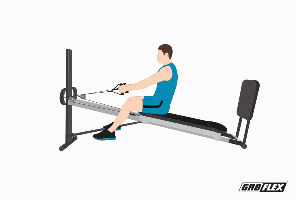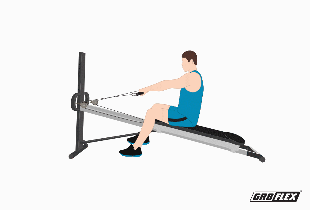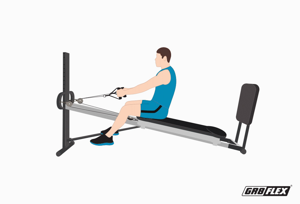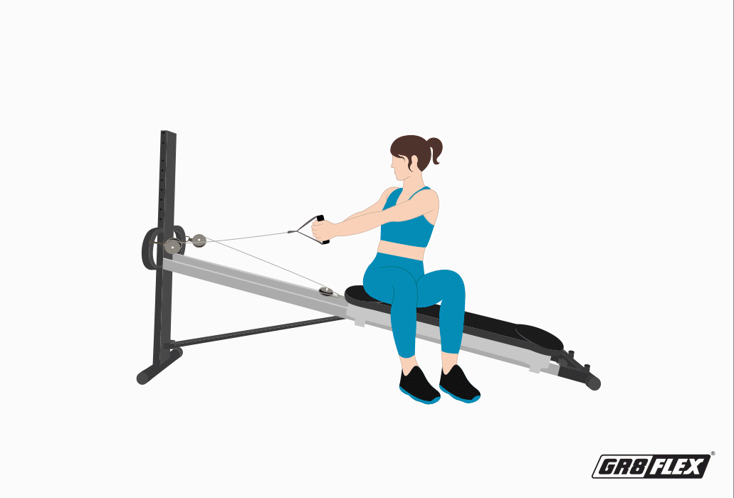 Sit on the bench pad and secure the EZ bar attachment on the GR8Flex. With an erect posture and a straight back, pull the bar with a pronated hand position towards your sternum. Keep your shoulders retracted and back neutral throughout the pull. Your elbow position should at a 45-degree angle to engage both the back and shoulders. Lower yourself slowly, and keep your hips and back straight and completely neutral. Avoid leaning forward or backward during the movement by allowing for a brief pause at the beginning and end of every repetition.