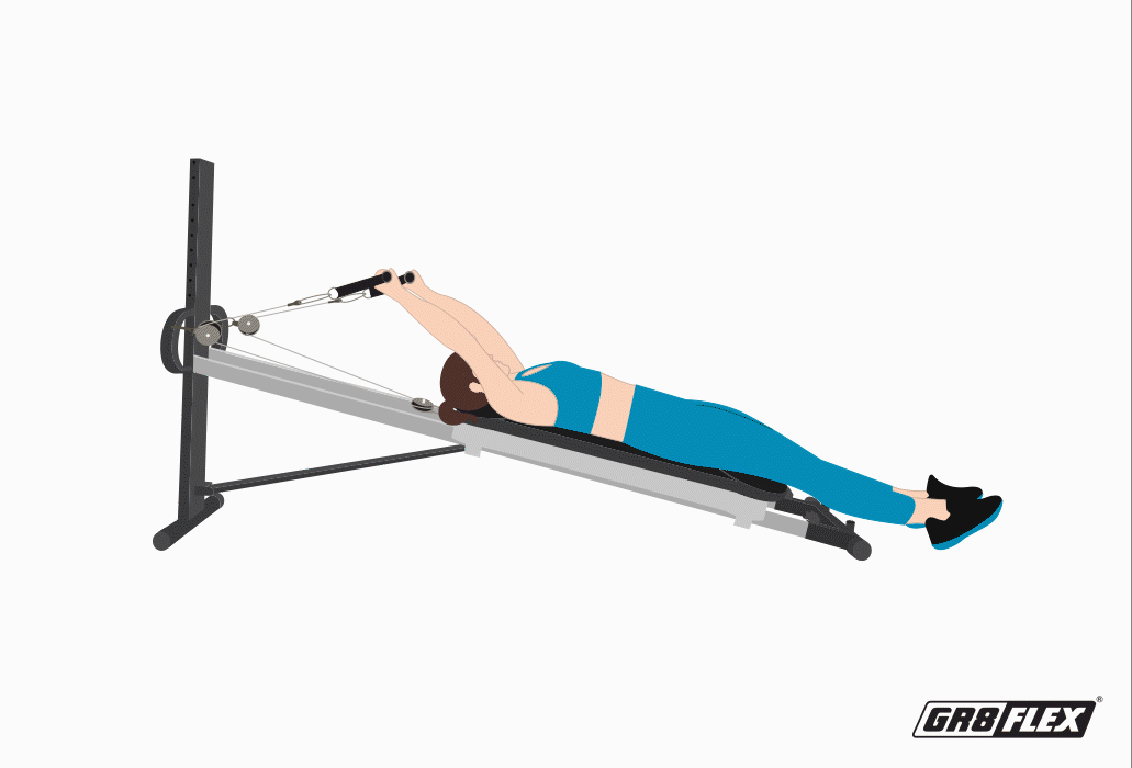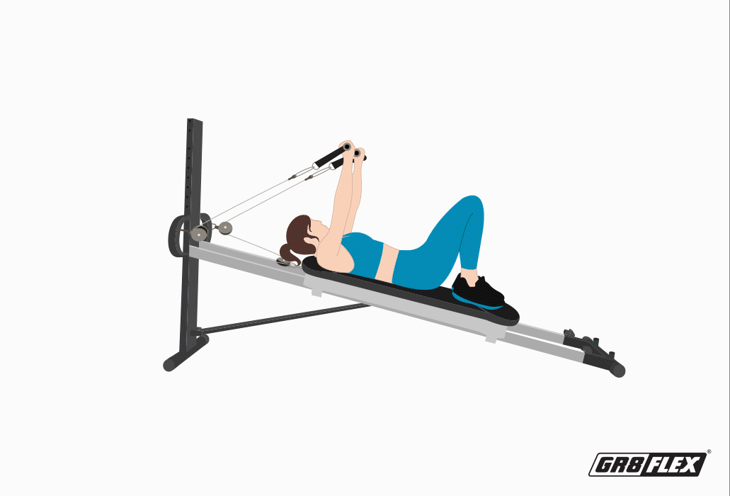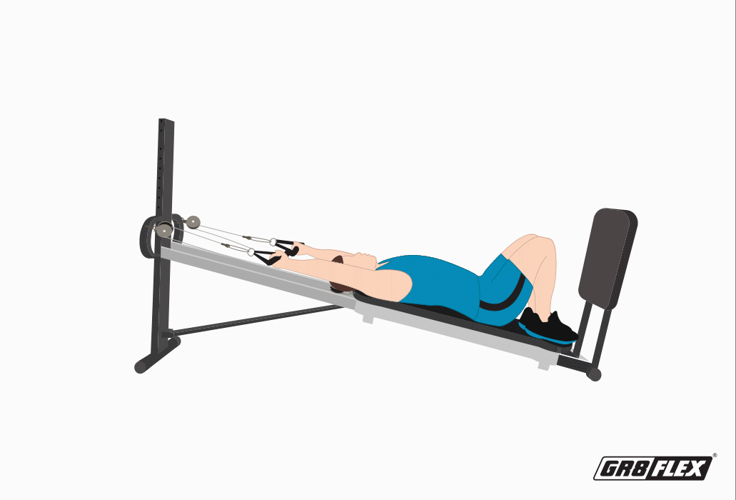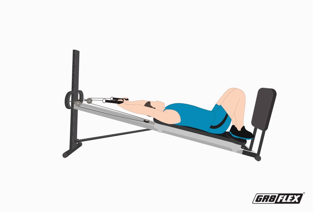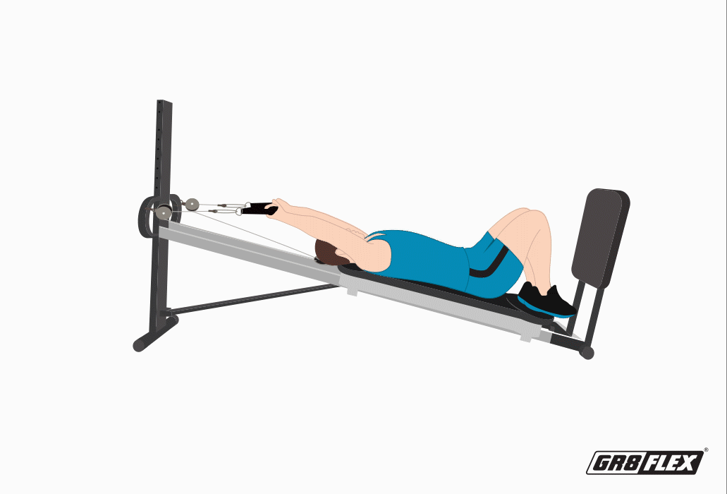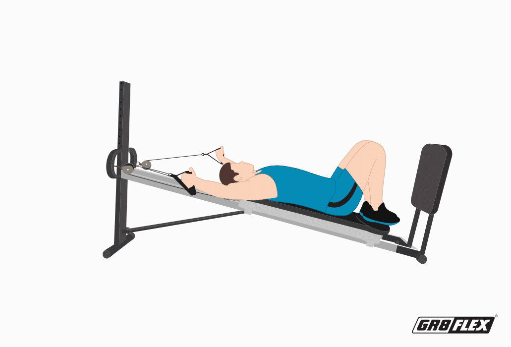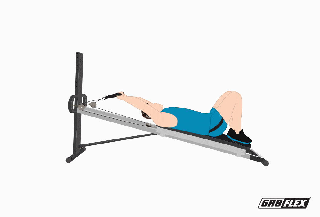 Lay on the bench pad with your back flat so that the handles are behind you. Grab both handles from above and keep your arms to your sides. Maintain a neutral position and keep your elbows tucked to your sides. Start by having your arms stretched and finish when your elbows are locked down. Do not swing or use momentum. Try to feel for the stretch in your arm (triceps) and force a squeeze at the end of the rep by pausing at the bottom and top.