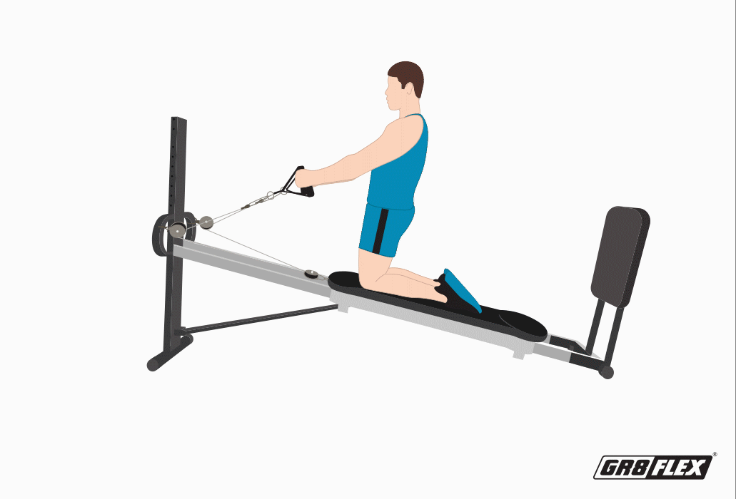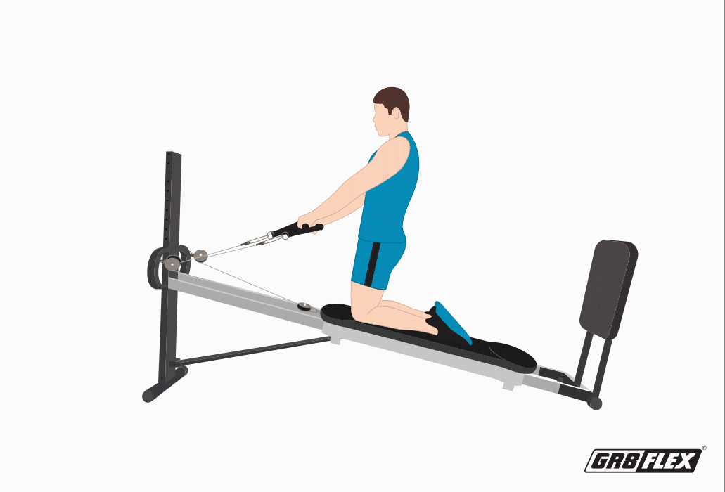 Set up on the bench pad while sitting on your knees and shins down on the pad. Start with your arms fully stretched out and your back in a neutral position. Row up while keeping your elbows at a 90-degree angle with your upper body. Your elbows should be out to the side and up instead of down to your sides. Finish the movement when the elbows are slightly past your body or as far as your shoulder will allow. Lower yourself slowly, and keep your hips and back straight and completely neutral. Avoid leaning forward or backward during the movement.