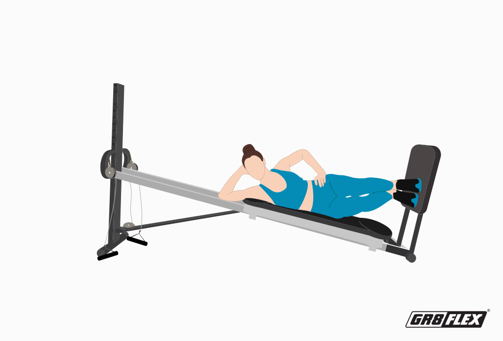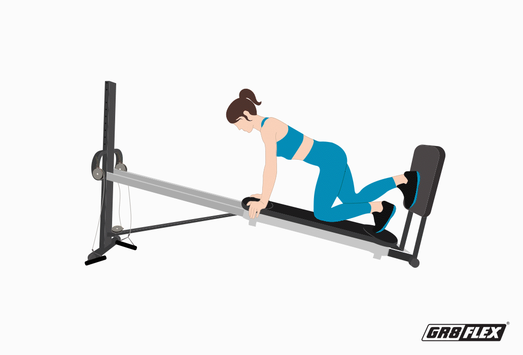 Place the ab accessory on the rail of the GR8 about 10 inches away from the cables. Lay on the bench pad with your knee on the pad and your feet slightly elevated. Grab the ab attachment and rest your forearms on the foam pad. Start the movement by pulling your lower body into the handles by crunching. Pull the knees into the handles and squeeze your ab muscles. Allow for a brief pause at the beginning and end of every repetition to prevent swinging or the use of momentum.