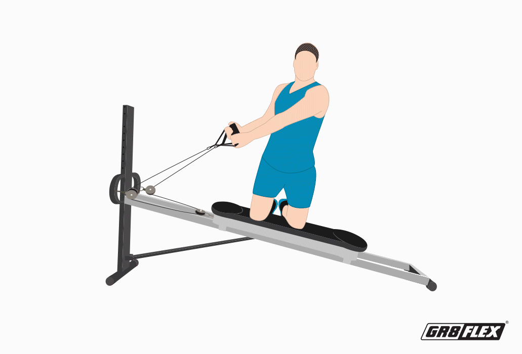 Sit sideways on the GR8 with your knees on the bench pad. Keep your hips locked and your back straight at all times. Grab both handles with both hands and pull them across your body. This is more of a twisting motion and it requires good balance. The handle should travel from the starting position to the middle of your body while keeping your arms slightly unlocked. Perform this movement very slowly as it is hard to maintain balance and do not swing or use momentum. Do this movement for the other side as well.