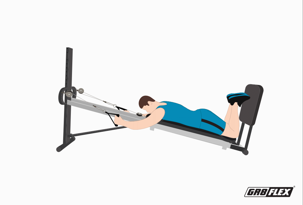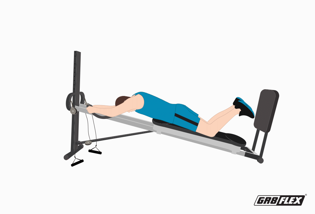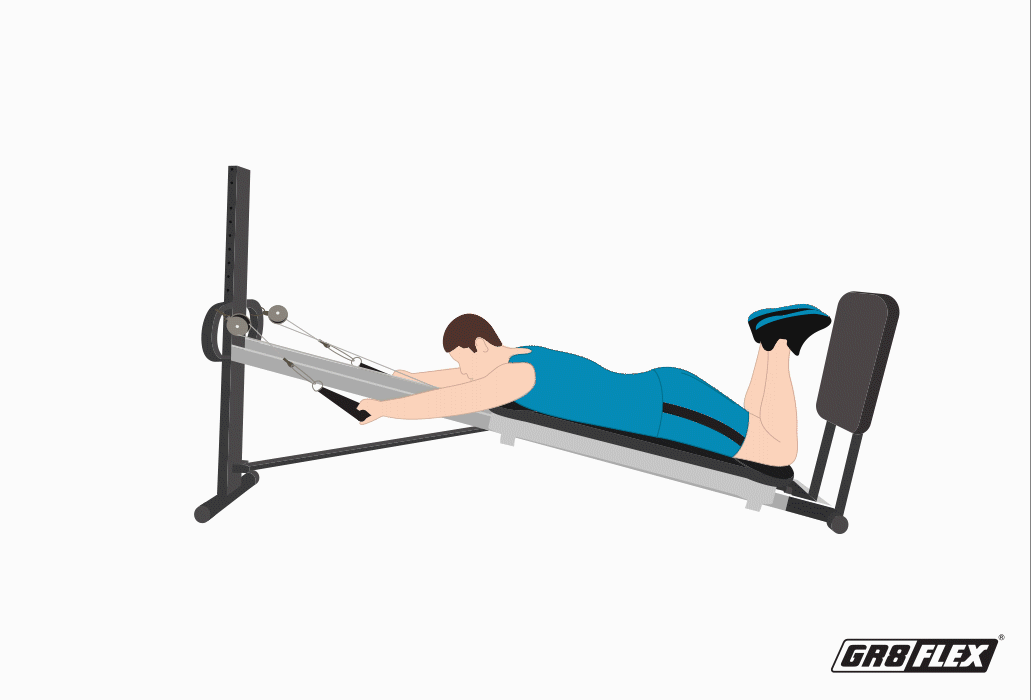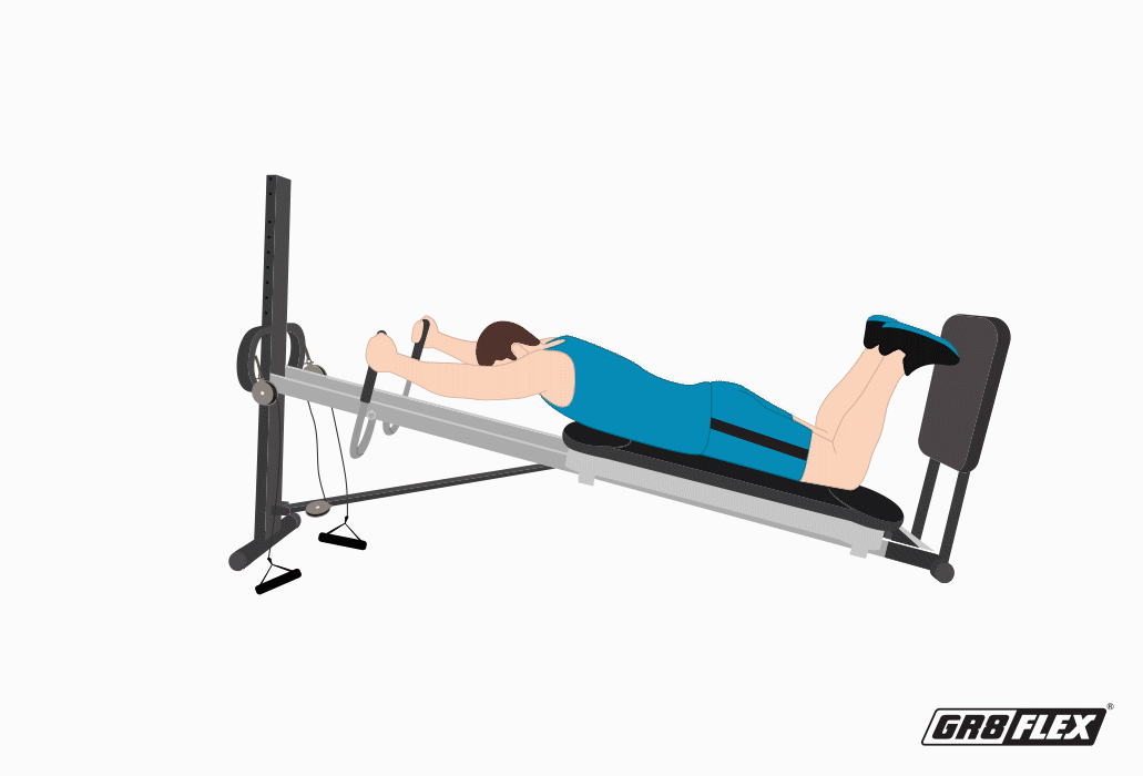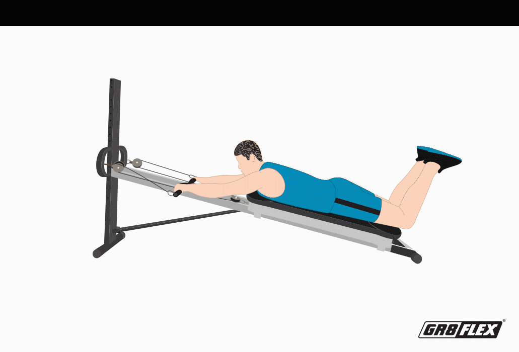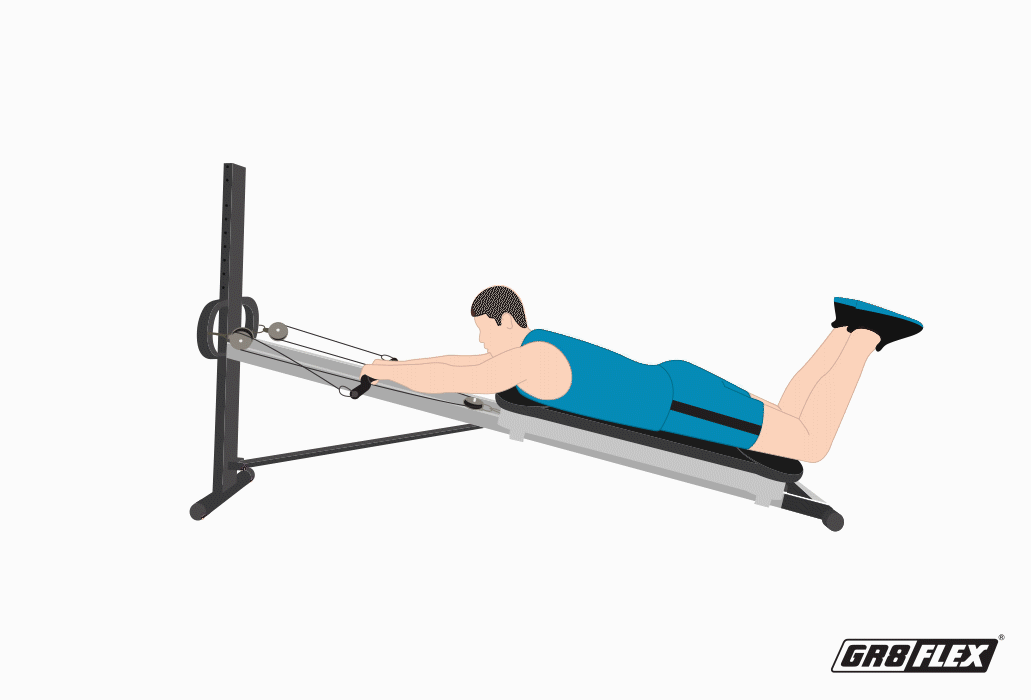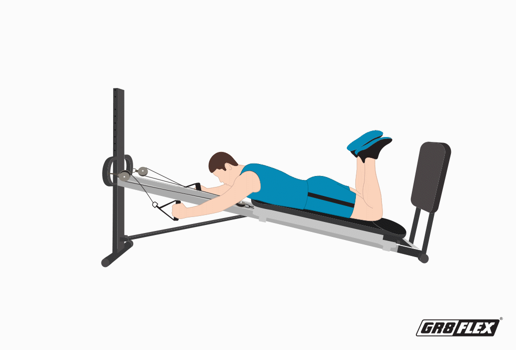 Grab both handles while laying down flat on your stomach on the bench pad. With your feet elevated, pull both handles towards your sides in one smooth motion. Lower yourself back down slowly before attempting another repetition. The starting position should be when your arms are stretched up overhead while grabbing the handles. Pull with your elbows out and finish with the elbows near your sides or as far as you can pull. Allow for a brief pause at the beginning and end of every repetition to prevent swinging or the use of momentum.
