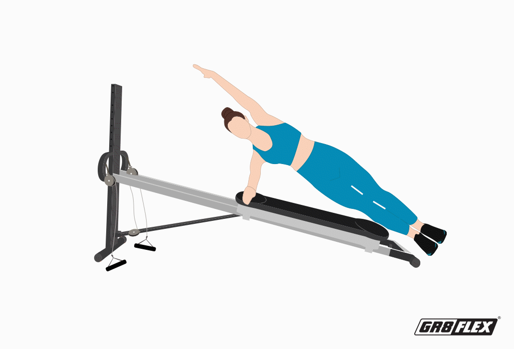Set up the bench pad and place your elbow and hand 4 inches away from the higher edge of the pad. Stack your feet together on the squat pad (lowered state) and straighten out your body. Keep your body straight and make sure that your elbow, shoulder, and head all line-up. Keep the other arm over your head and straight. Maintain tension in your core and count the seconds for each side.