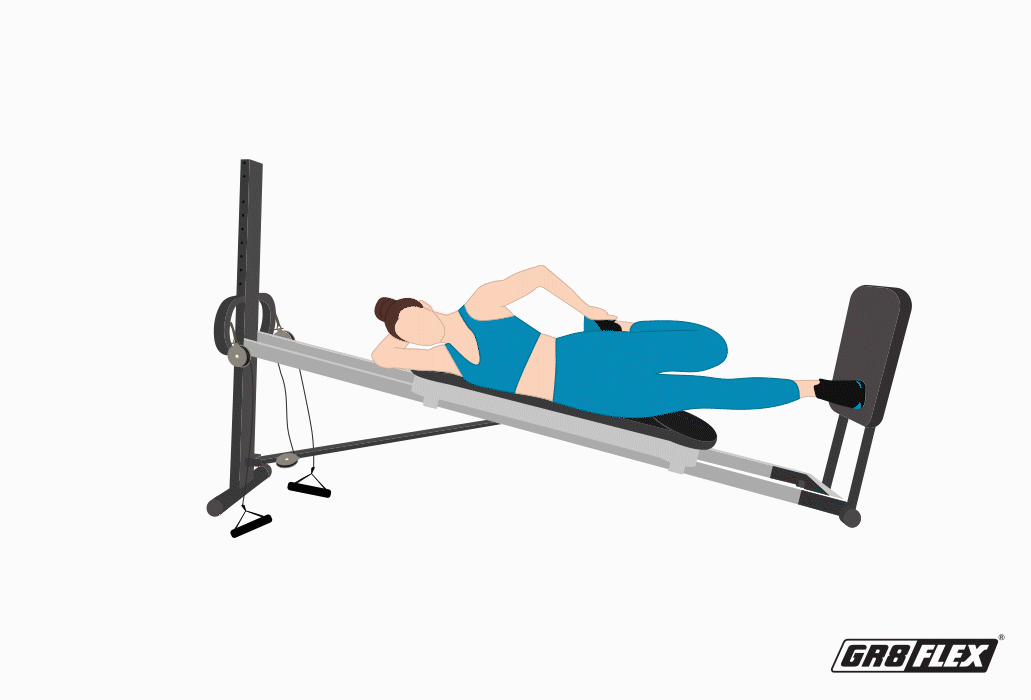 Using the handles attachment, lay on the bench pad. Hook both of your feet on the handles and sit with your butt on the bench pad. With a moderate bend in your knees, reach forward with your elbows keeping your hands crossed on your chest with the right hand on the left shoulder and the left hand on the right shoulder. Reach forward with a twisting motion by touching your right left to the left knee and the left shoulder to the right knee alternating in every rep. Stretch your abs at the start of the movement and contract hard at the end portion of the exercise.