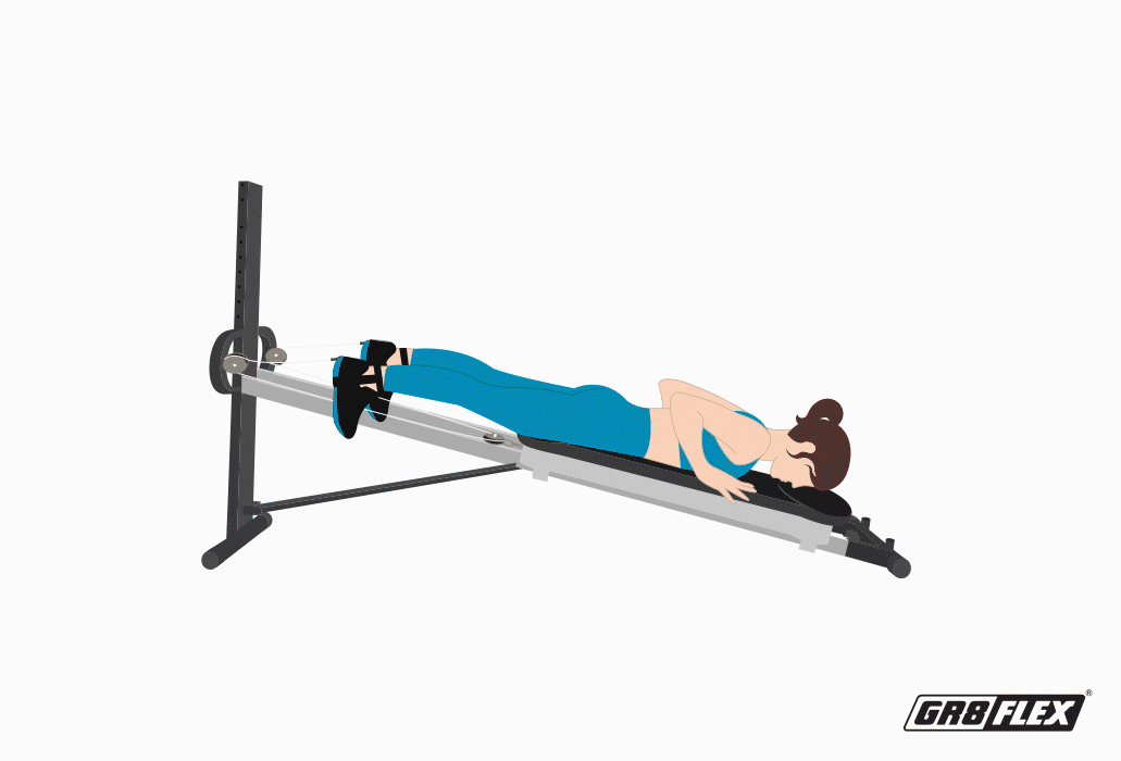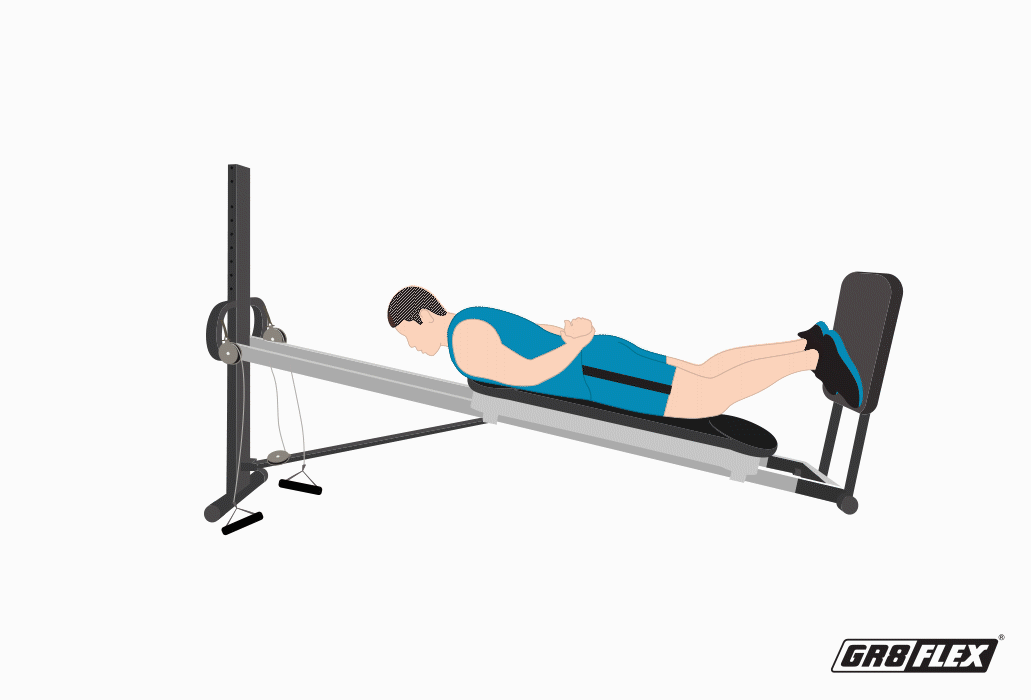 Using the strap cuff attachment, hook your feet on both sides and ensure that they are secure. Lay on the pad with your stomach and hold the pad tightly. Start the exercise by being straight and pulling your body weight up using your hamstring muscles. Slowly lower your bodyweight down after completing the rep. Use a brief pause at the top of the rep when your hamstrings are fully contracted.