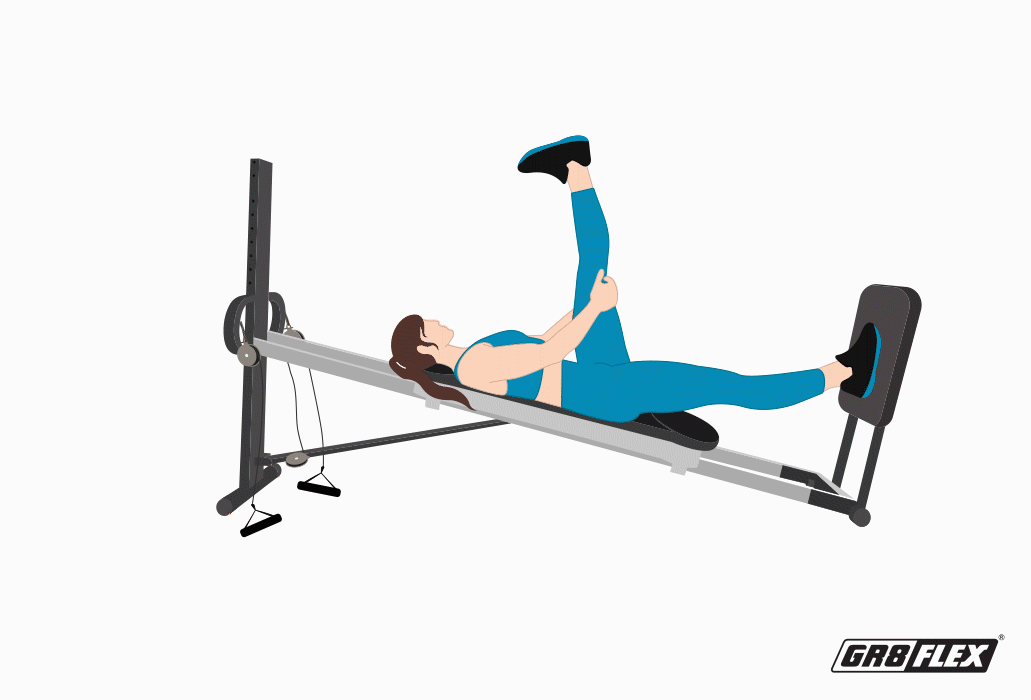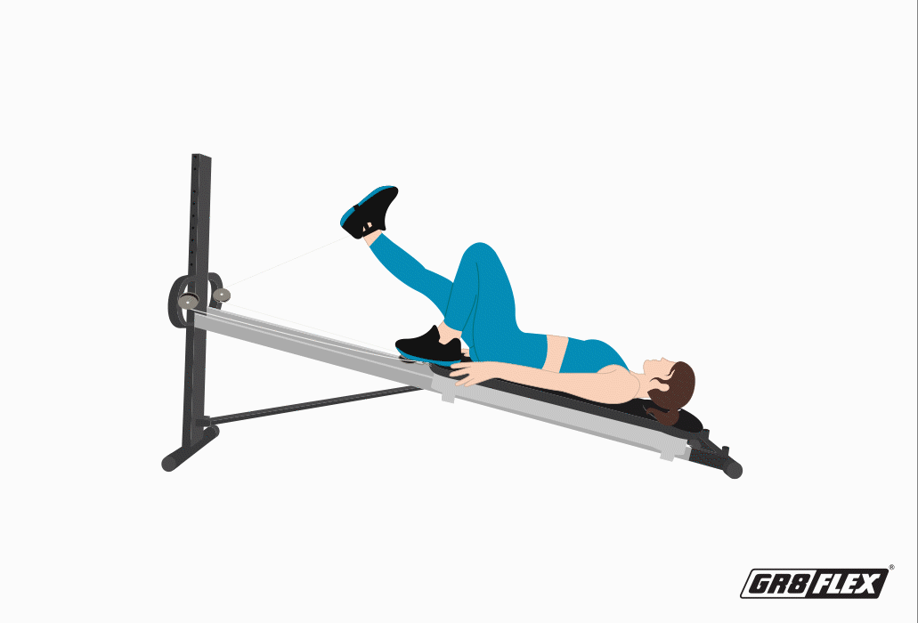 Using both handles, lay on your back and grab the handles. Lock the bench pad midway through the slide and brace for the start of the movement. Start by having your legs completely straight and locked on the knees. Start by raising your legs straight up in one smooth motion. The movement finishes when your leg is at a 90-degree angle with your torso. Lower your leg down to the starting position and ensure that your knee remains locked during the entire movement.