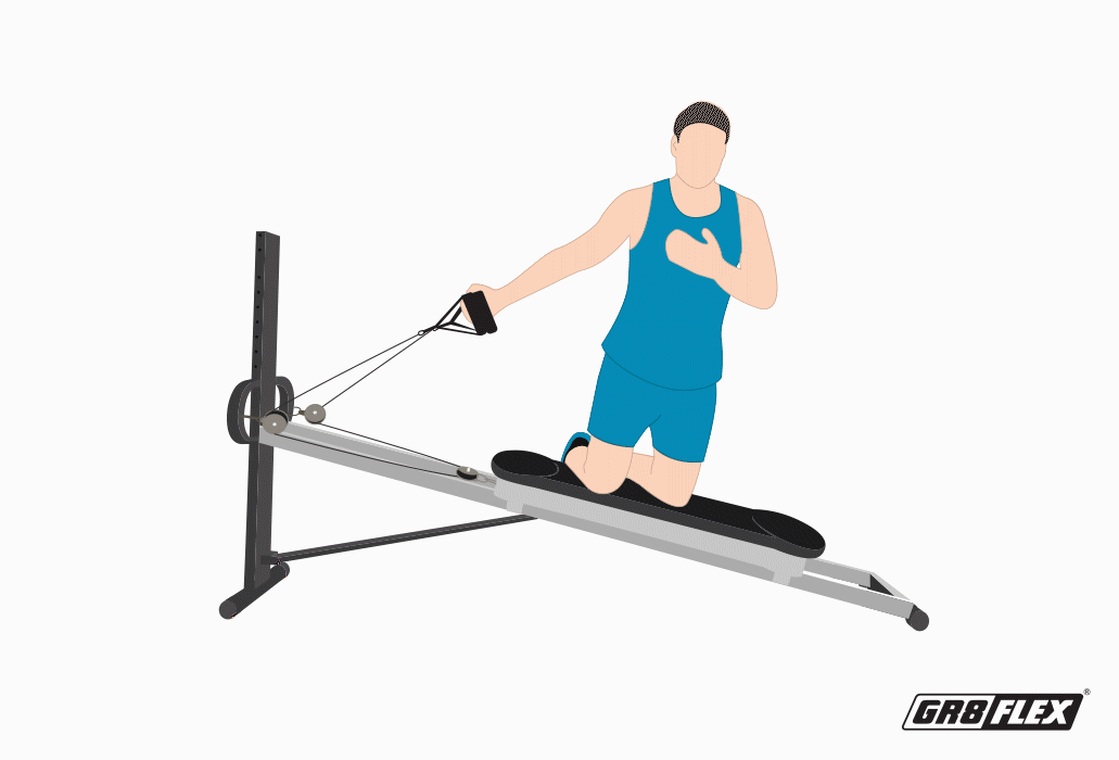 Sit sideways on the GR8 with your knees on the bench pad. Keep your hips locked and your back straight at all times. Grab one handle at a time and raise it across your body. This movement is more advanced. The handle should travel from the starting position to the middle of your body while keeping your arms slightly unlocked. Keep the free arm on your chest for support and balance and to produce better contractions. Perform this movement very slowly as it is hard to maintain balance and do not swing or use momentum.