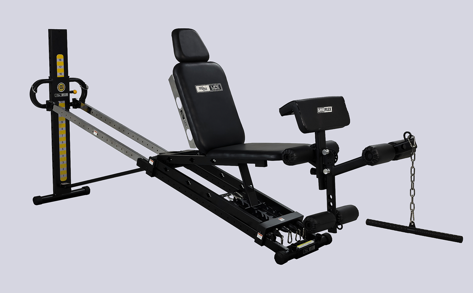 Supports up to 18 resistance levels + 10-50 lb bands & plate-loading.